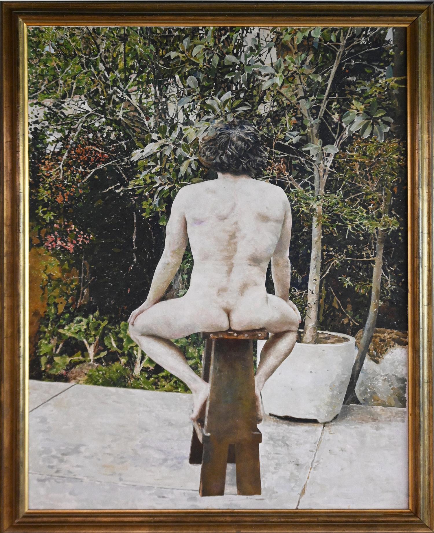 JOHN LENNOX, THE STOOL MAN, OIL ON CANVAS, SIGNED VERSO, 135 X 100CM, FRAME SIZE: 154 X 117CM