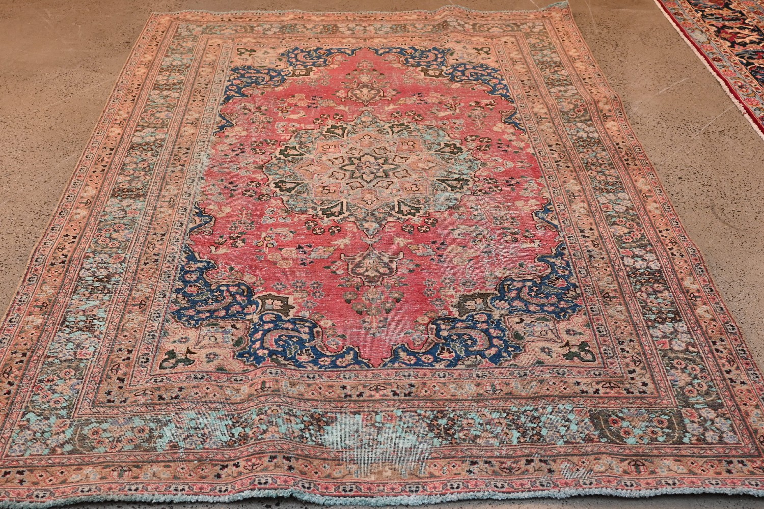 A MODERN PERSIAN VINTAGE TABRIZ OVER-DYED CARPET. 100% WOOL, PILE IN SAPHIRE BLUE, MINT GREEN, AND RED TONES. ORIGIN: PERSIA SIZE: 294 X 195 CM