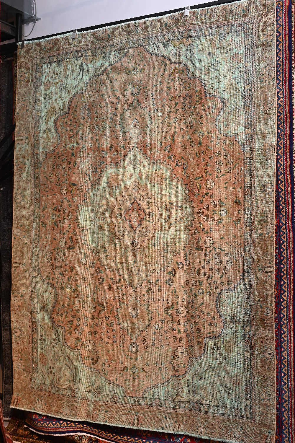 A MODERN CONTEMPORARY TRANSITIONAL PERSIAN VINTAGE OVER-DYED CARPET. ELONGATED CENTRAL MEDALLION ON A FIELD OF ROSETTES. OVER-DYED IN TAUPE AND FRENCH BLUE TONES WITH ROSE HIGHLIGHTS. SIZE: 298 X 215 CM ORIGIN: PERSIA - CONDITION: EX GALLERY DISPLAYED