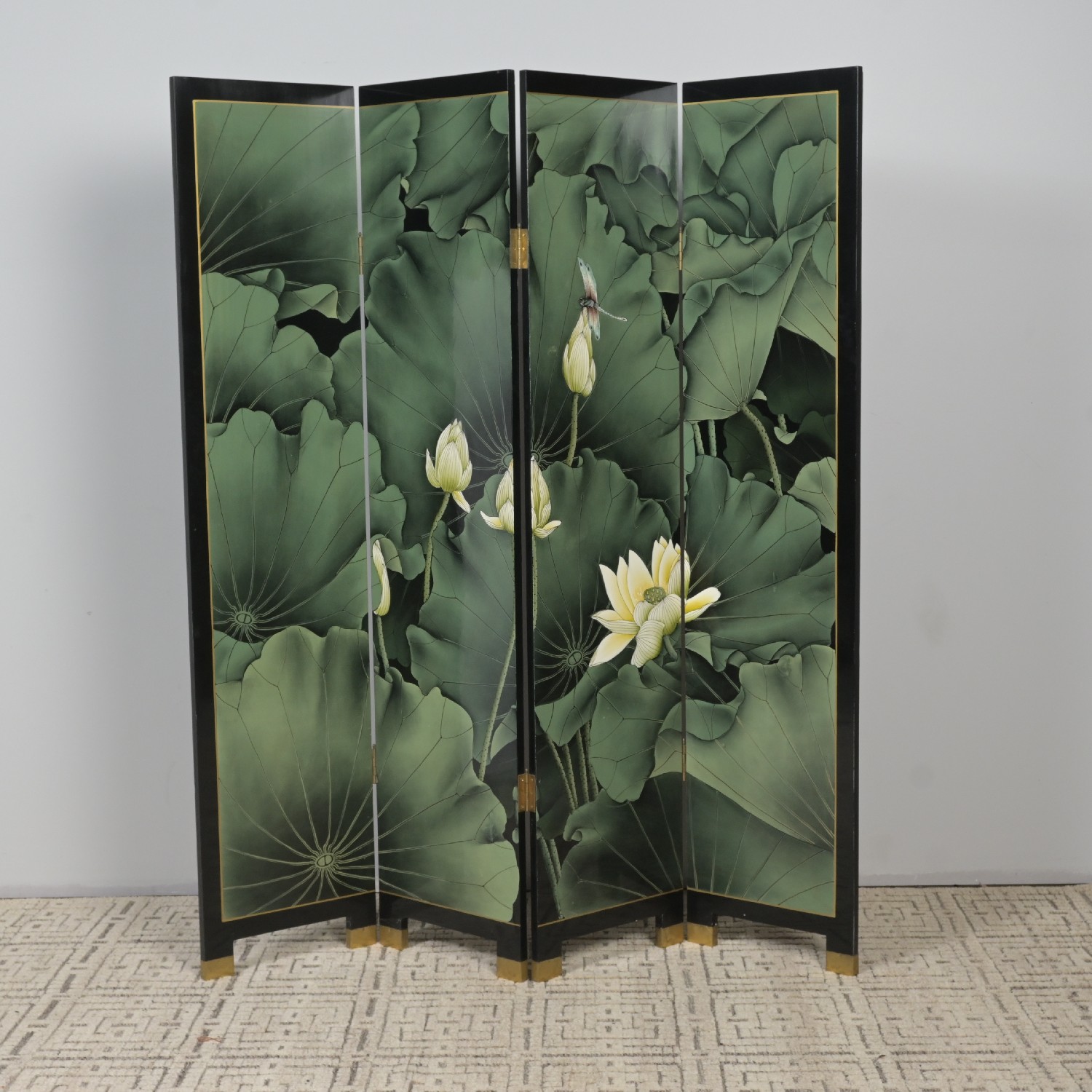 A CHINESE LACQUERED FOUR PANEL PRIVACY SCREEN WITH PAINTED DETAILING (183H X 40W CM PER PANEL) (LEONARD JOEL DELIVERY: X-LARGE)