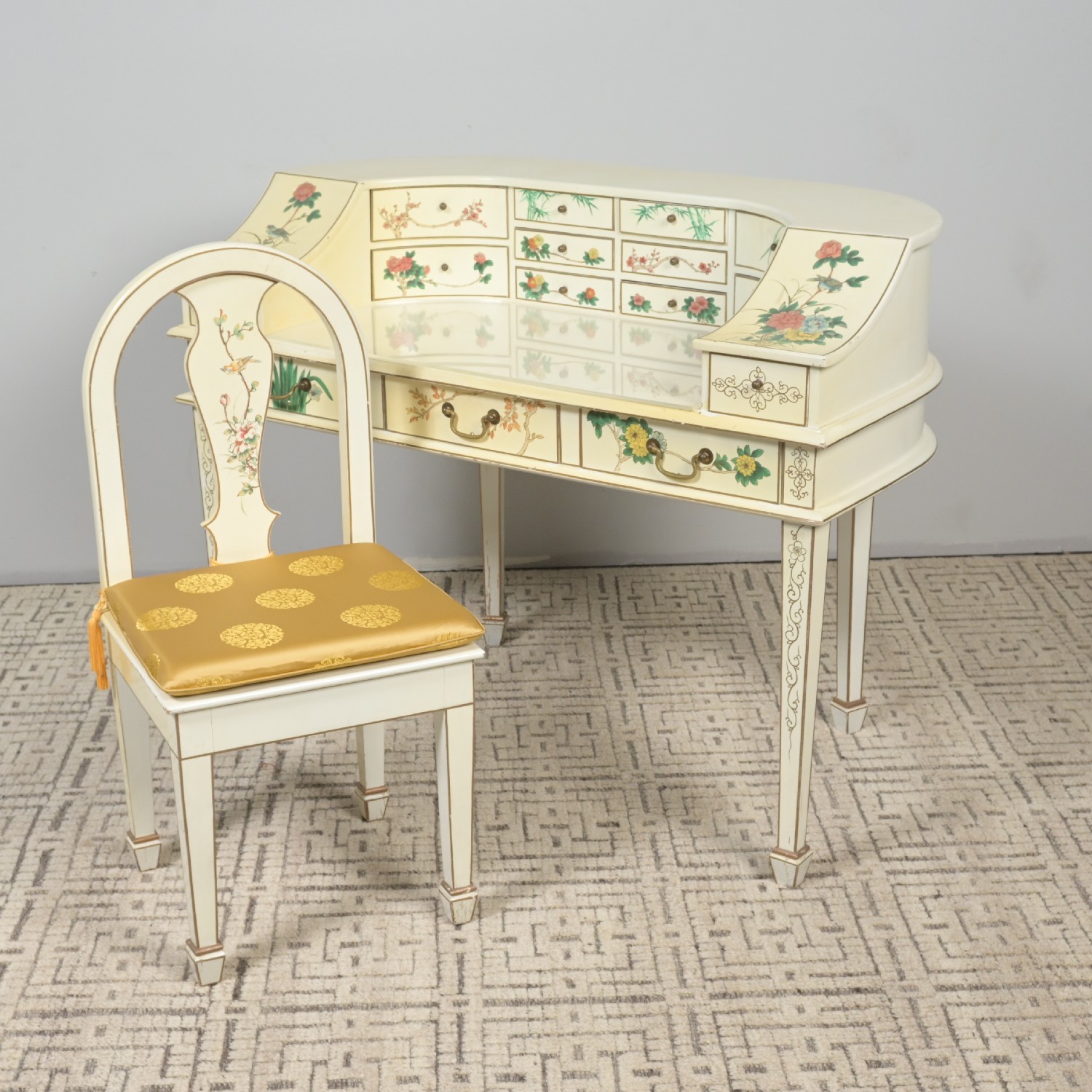 A CARLTON HOUSE STYLE LACQUERED CHINOISERIE DESK WITH MATCHED CHAIR (A/F) (DESK (97H X 127W X 70D CM) (THIS HEAVY ITEM MUST BE REMOVED BY CARRIERS AT THE CUSTOMER'S EXPENSE. LEONARD JOEL STAFF CANNOT ASSIST CARRYING THIS ITEM)