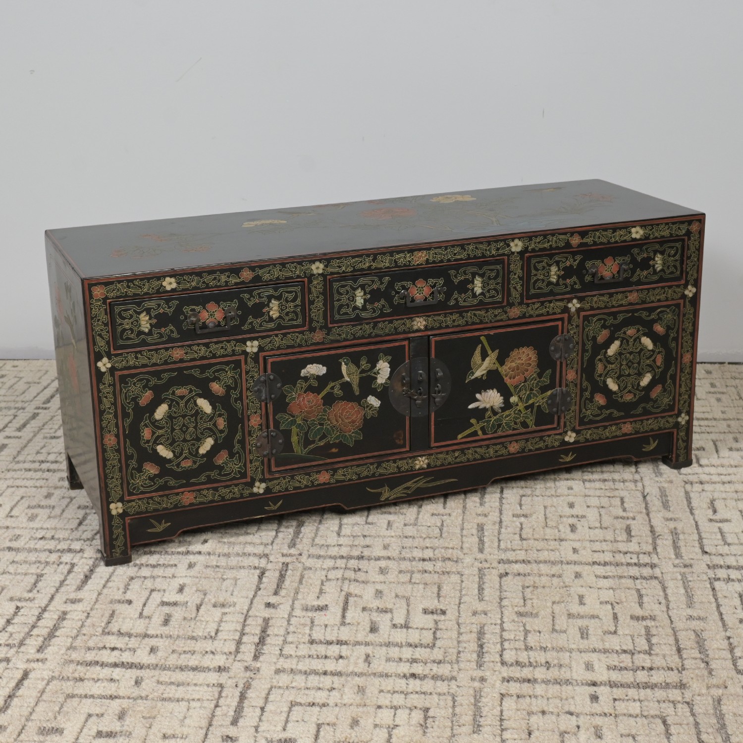 A CHINESE EBONISED & PAINTED LOWLINE CABINET (48H X 110W X 39D CM) (LEONARD JOEL DELIVERY: X-LARGE)