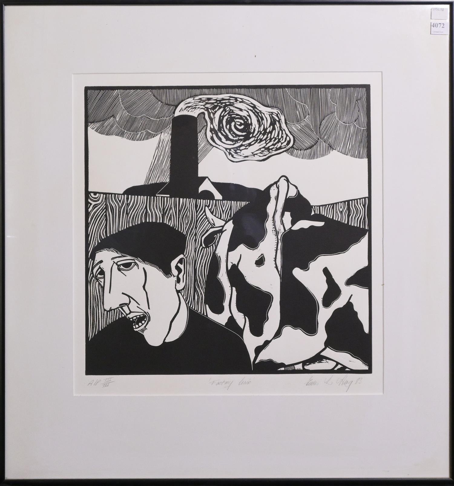 EUAN HENG, FACTORY COW'S 1983, LINOCUT ED. A/P 3/3, SIGNED, TITLED, DATED AND EDITIONED BELOW IMAGE, 39.5 X 39.5CM, FRAME SIZE: 66 X 63.5CM