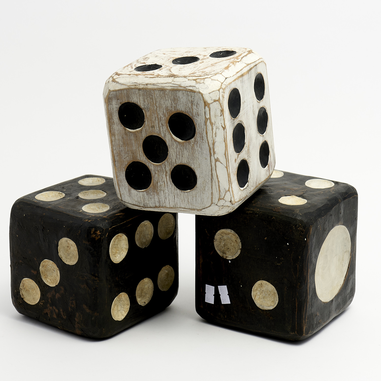 THREE LARGE NOVELTY CARVED WOODEN DICE H.15.5CM (TALLEST), LEONARD JOEL DELIVERY SIZE: MEDIUM