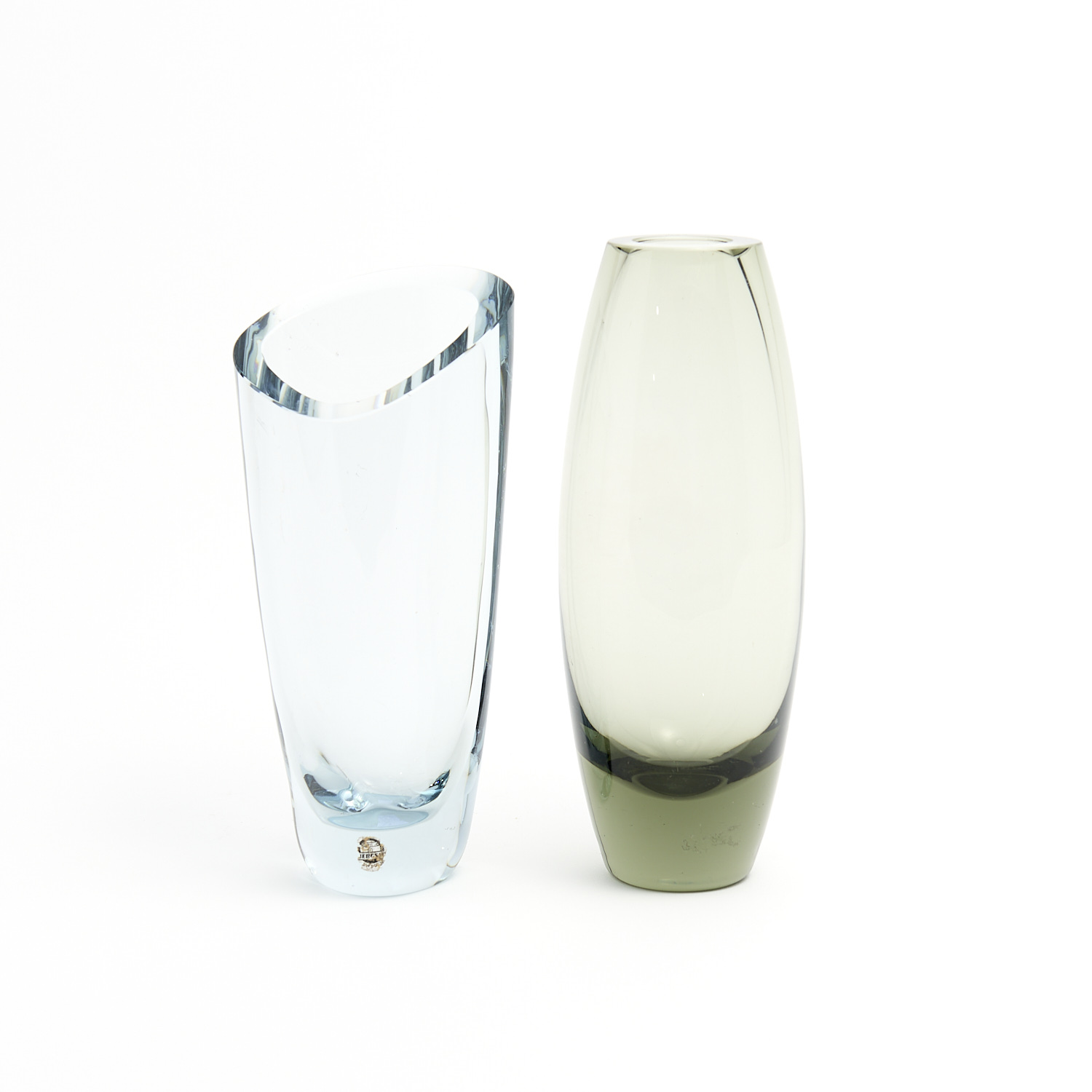 TWO GLASS VASES INCLUDING SWEDISH AND HOLMEGAARD H.22.5CM (TALLEST), LEONARD JOEL DELIVERY SIZE: MEDIUM