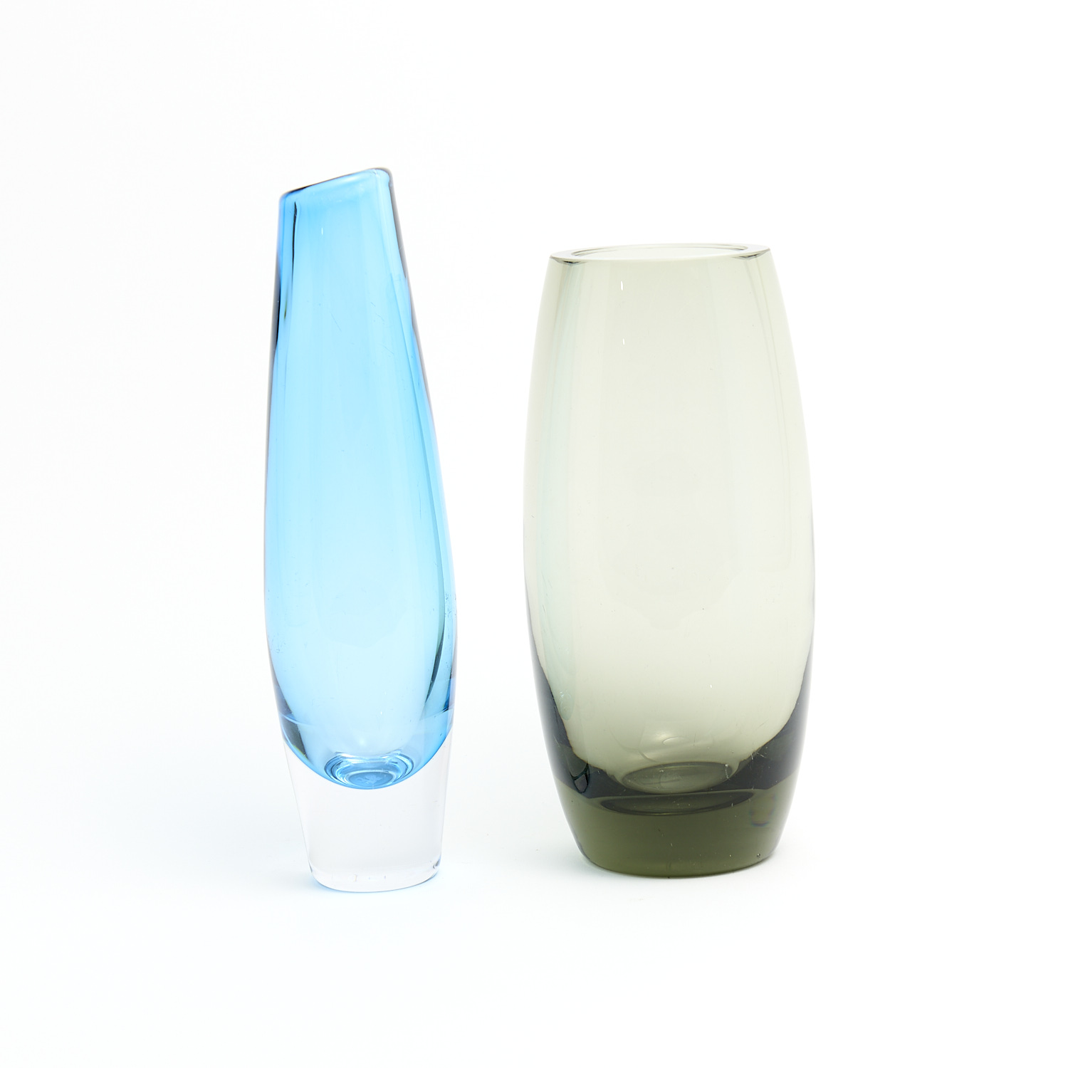 TWO MID-CENTURY GLASS VASES INCLUDING A BLUE ORREFORS AND GREY HOLMEGAARD H.29.5CM (TALLEST), LEONARD JOEL DELIVERY SIZE: MEDIUM