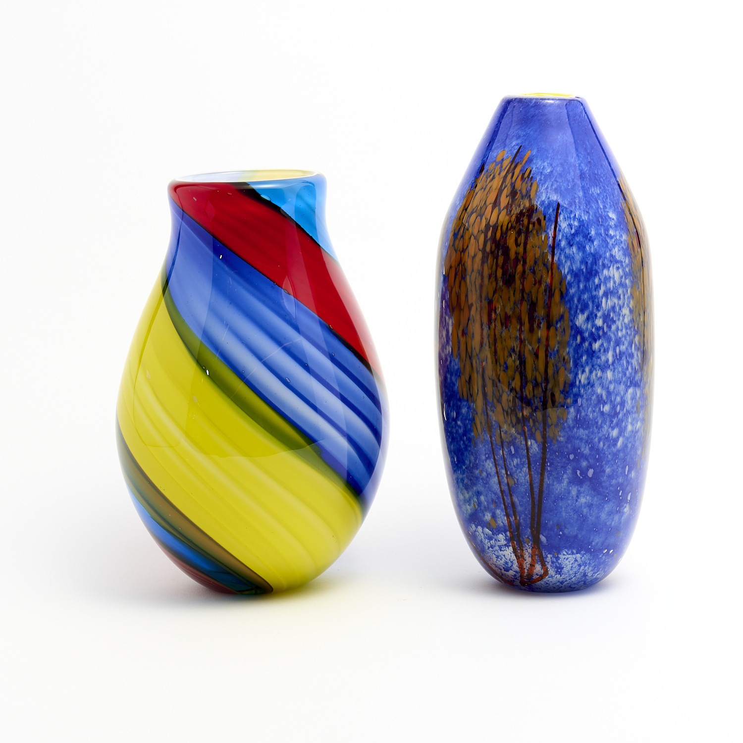 TWO LARGE RETRO CASED BRIGHT COLOURED ART GLASS VASES H.32CM (TALLEST), LEONARD JOEL DELIVERY SIZE: MEDIUM