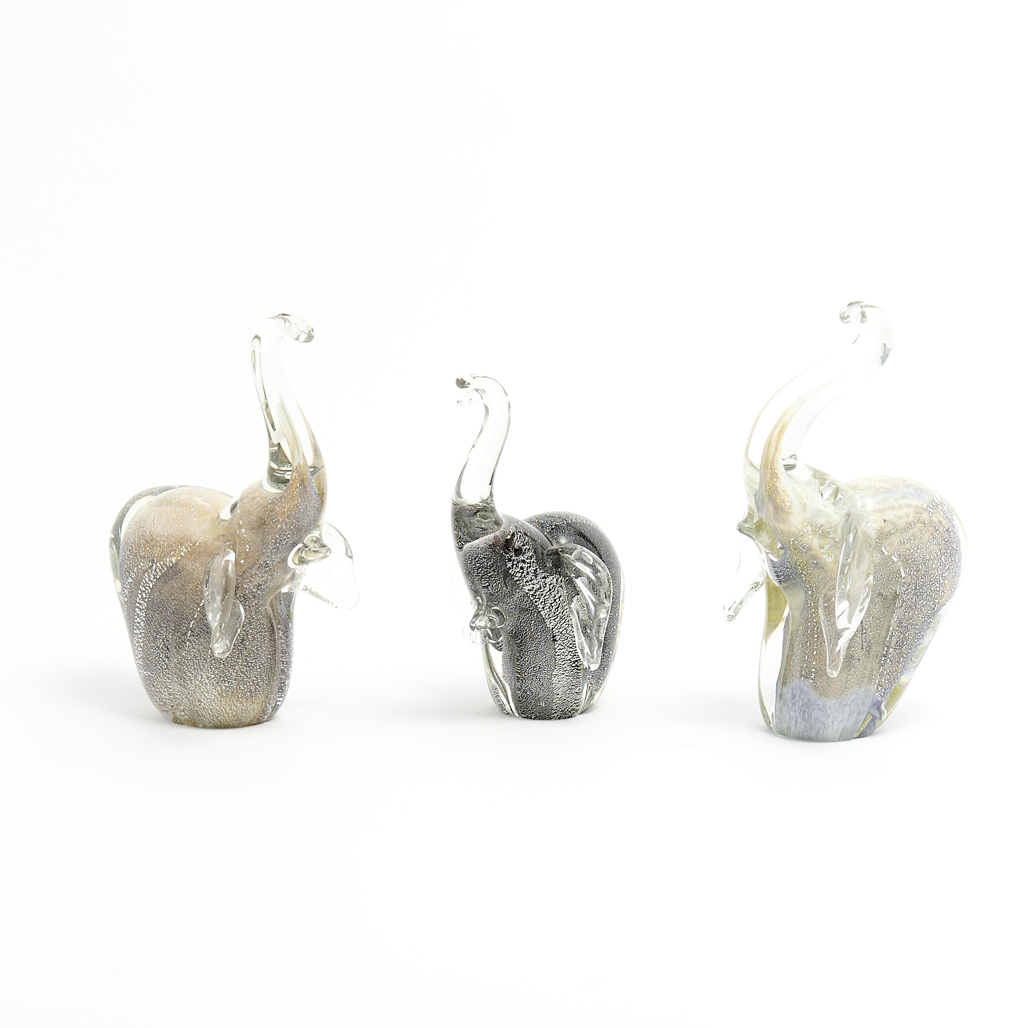 A COLLECTION OF THREE MURANO GLASS ELEPHANTS WITH SILVER FOIL INCLUSION H. 16.5CM, LEONARD JOEL DELIVERY SIZE: SMALL