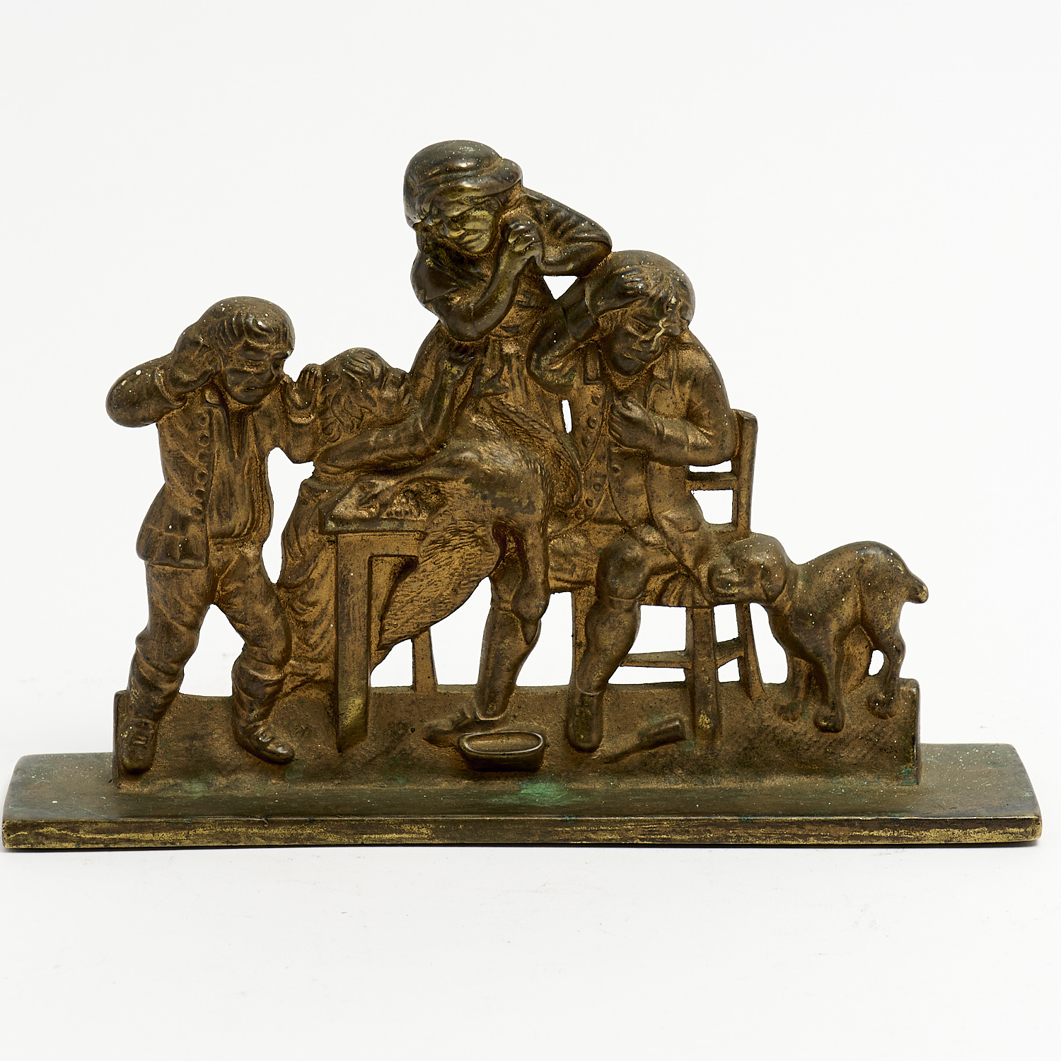 AN ANTIQUE FRENCH GILDED BRONZE TAVERN SCENE DOORSTOP W.28CM, LEONARD JOEL DELIVERY SIZE: LARGE