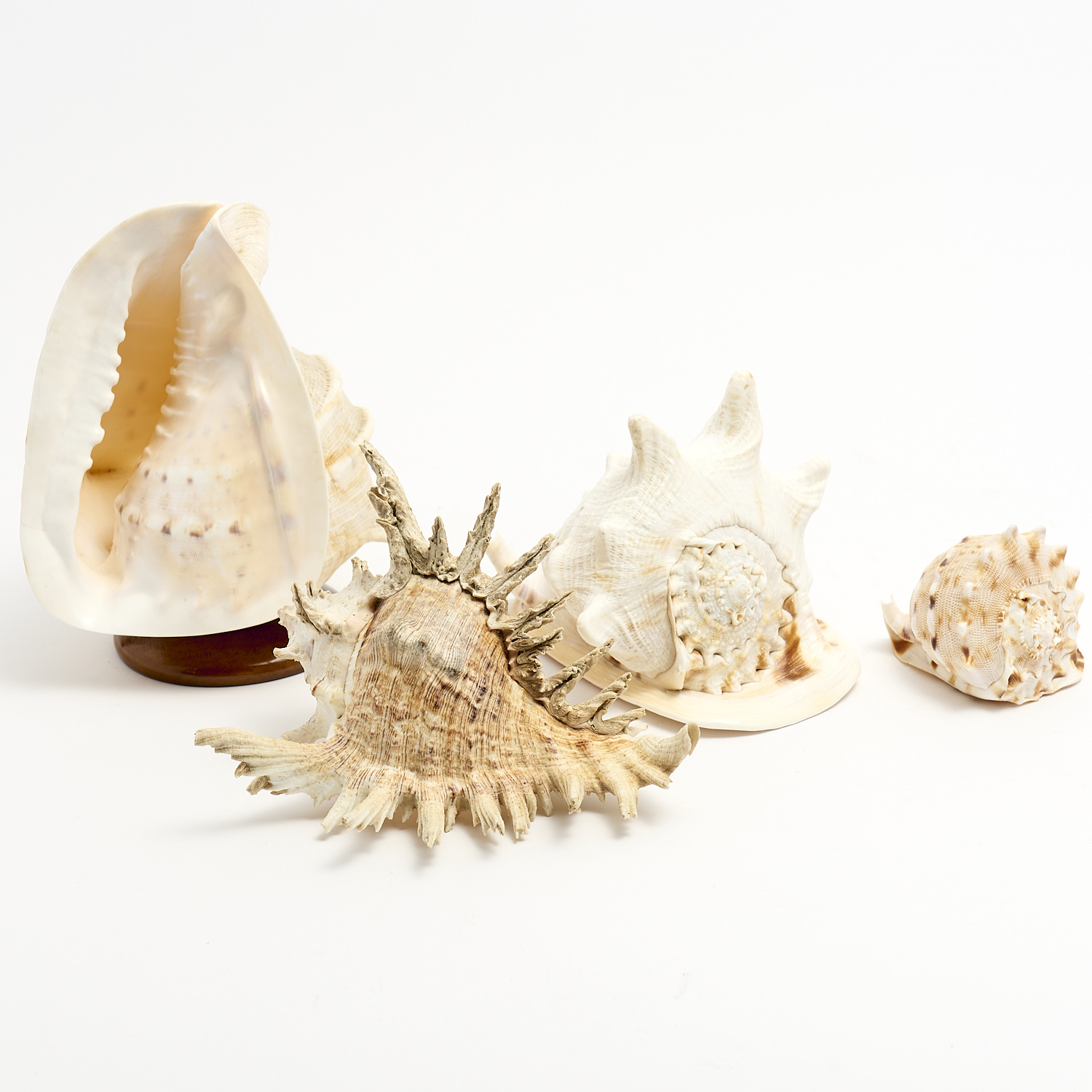 A COLLECTION OF FOUR CONCH SHELLS H.23.5CM (TALLEST), LEONARD JOEL DELIVERY SIZE: MEDIUM
