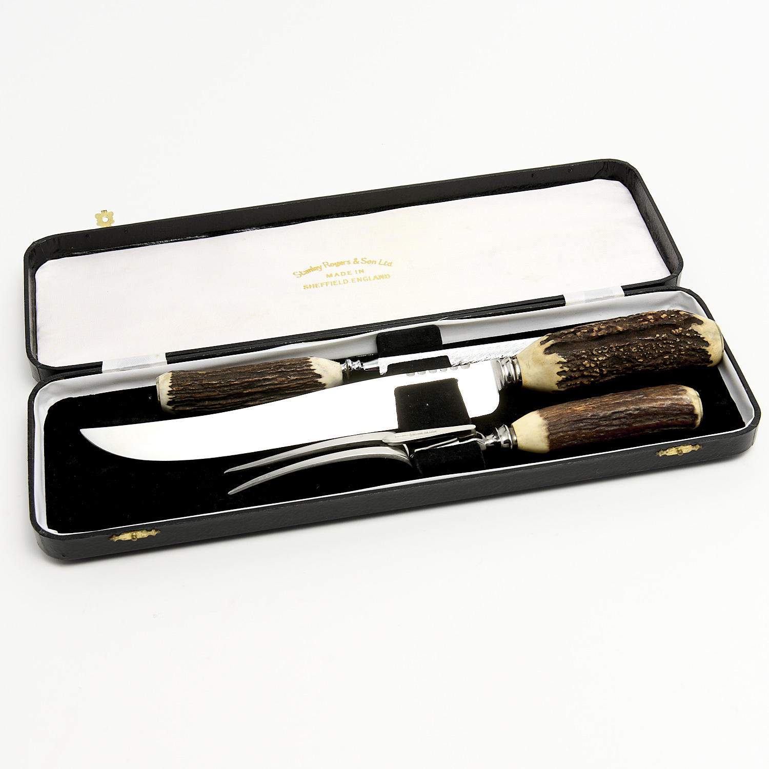 A CASED THREE PIECE STANLEY ROGERS SHEFFIELD ENGLAND ANTLER HANDLED CARVING SET L.36CM (LONGEST KNIFE), LEONARD JOEL DELIVERY SIZE: MEDIUM