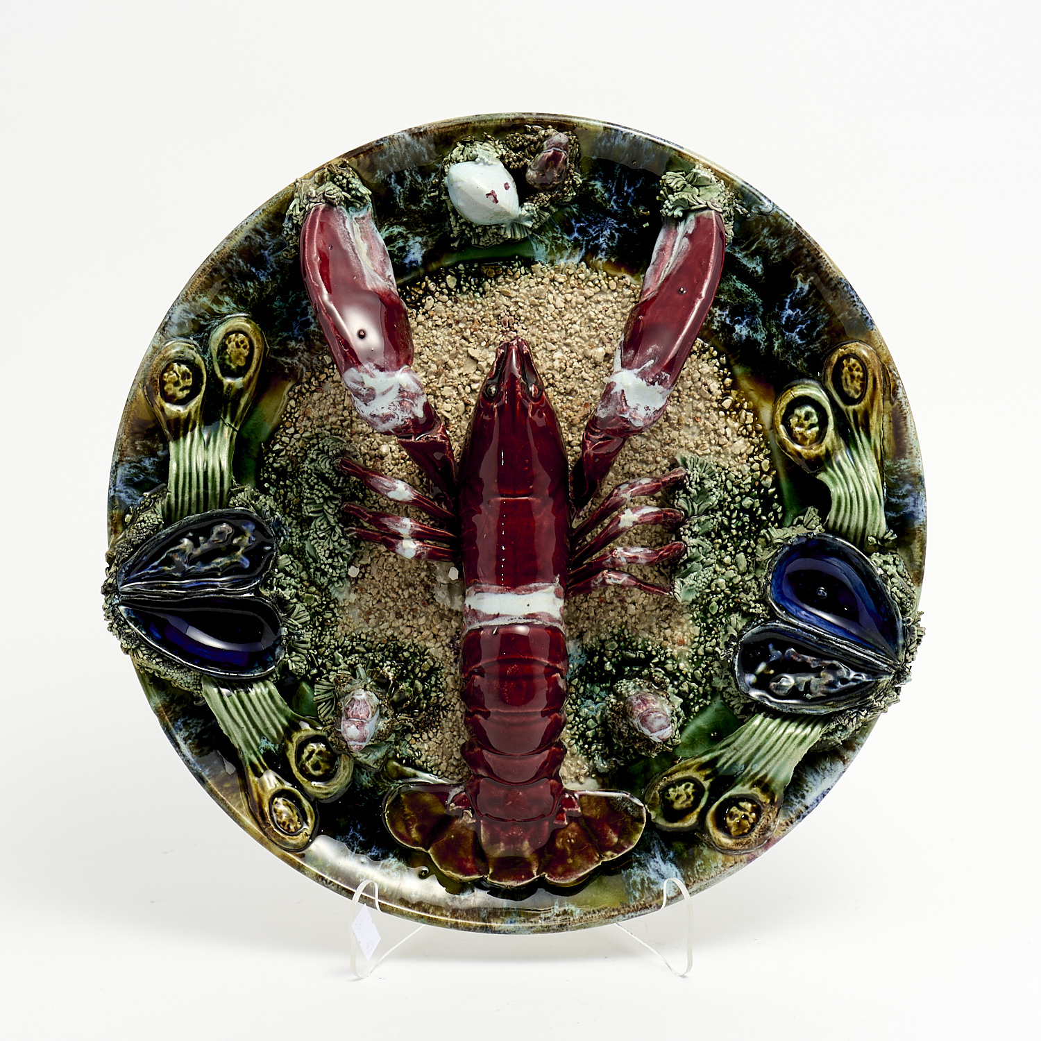 A MAJOLICA LOBSTER AND SEA CREATURE PLATE (A/F) DIA.33CM, LEONARD JOEL DELIVERY SIZE: MEDIUM