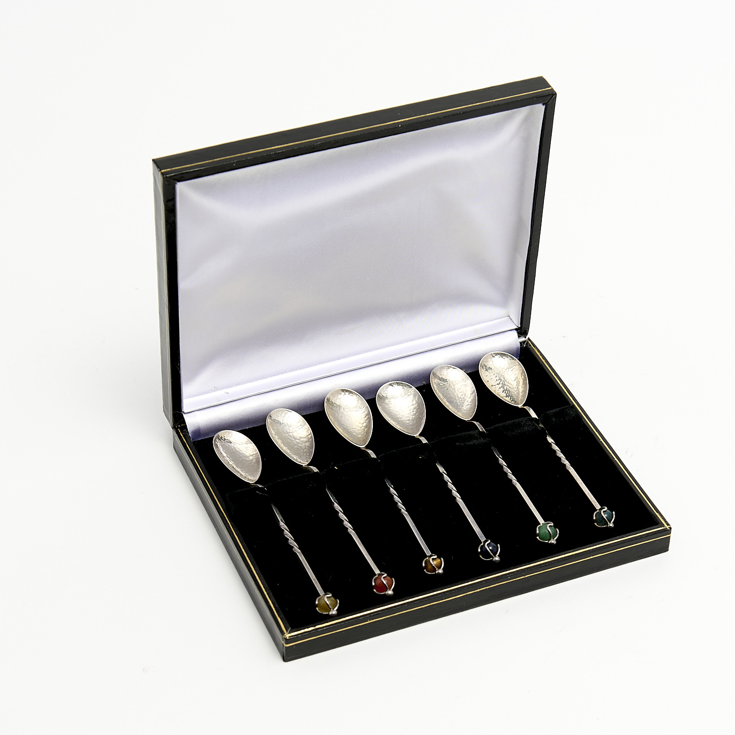 A CASED SET OF SIX AUSTRALIAN HALLMARKED STERLING SILVER TEASPOONS WITH ASSORTED STONE BALL ENDS L.11CM (EACH SPOON), LEONARD JOEL DELIVERY SIZE: SMALL