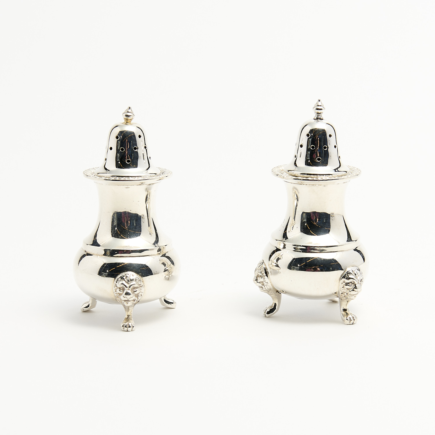 A PAIR OF STERLING SILVER FOOTED SALT AND PEPPER POTS WITH LION HEAD MOUNTS W.214G, H.10CM, LEONARD JOEL DELIVERY SIZE: SMALL