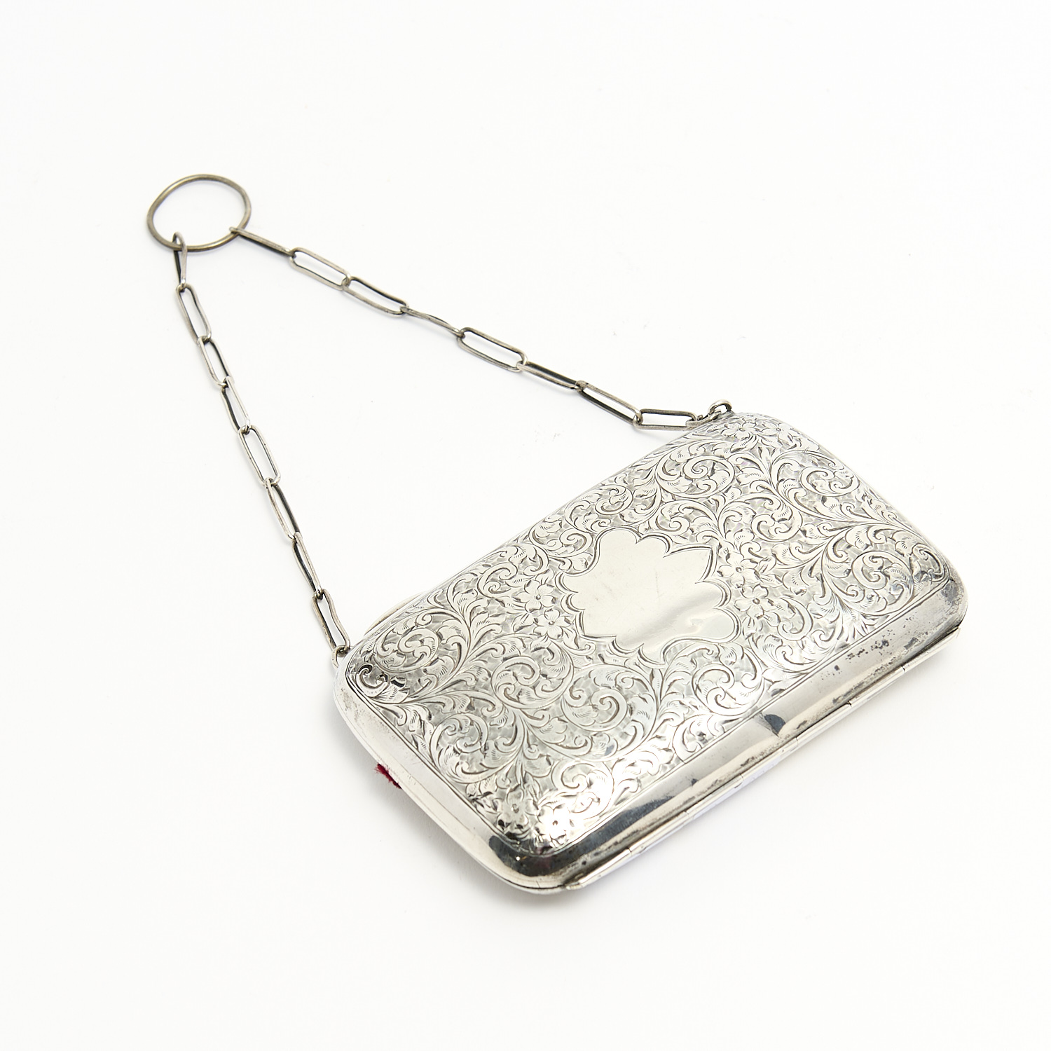 AN ENGLISH HALLMARKED STERLING SILVER HEAVILY ENGRAVED SILK LINED EVENING PURSE W.180G, L.12CM, LEONARD JOEL DELIVERY SIZE: SMALL