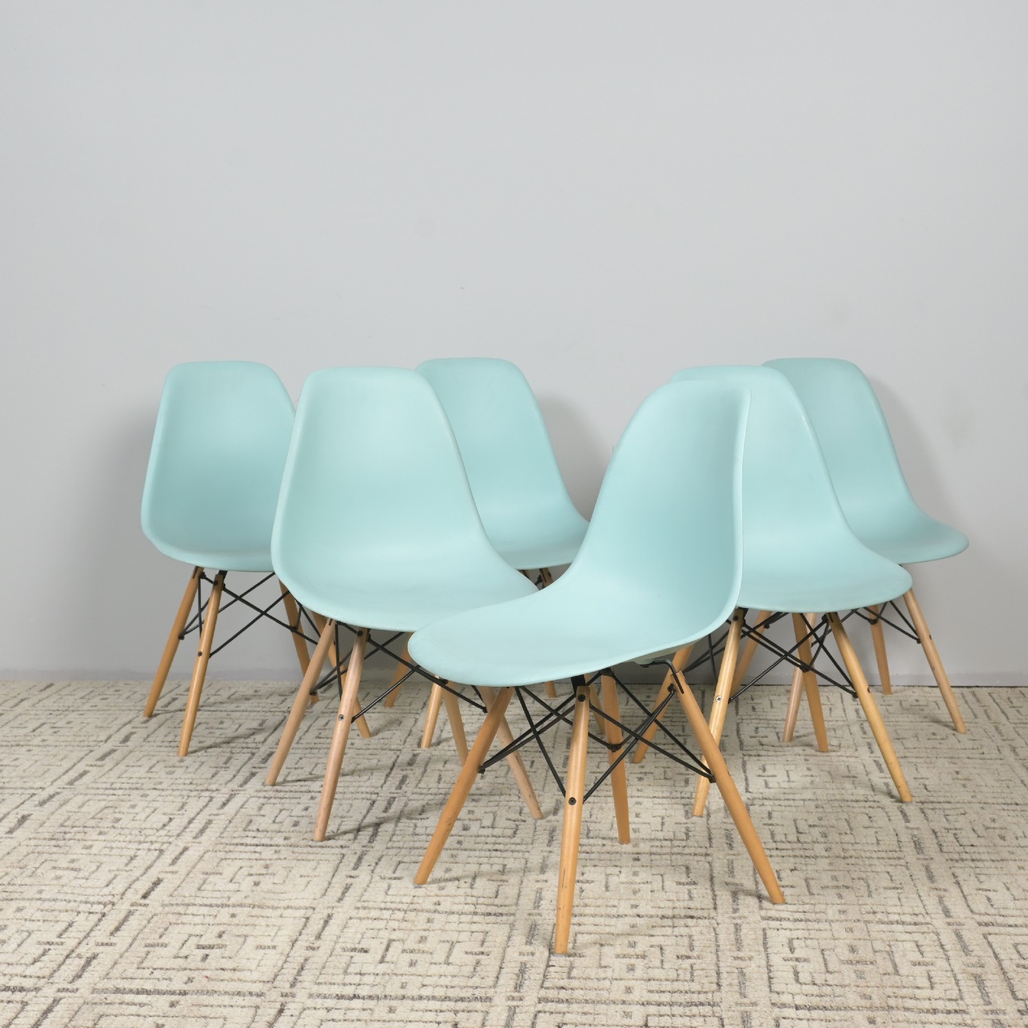 A SET OF SIX EAMES BLUE DINING CHAIRS (81H X 44W X 51D CM) (LEONARD JOEL DELIVERY: X-LARGE)