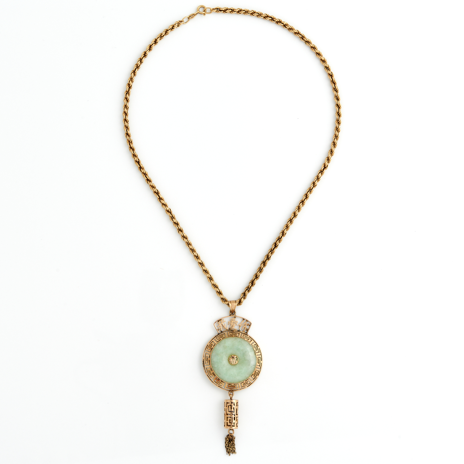 A HARD STONE PENDANT TO A CHAIN IN 14CT GOLD, THE PENDANT MEASURING 35MM X 75MM, 460MM