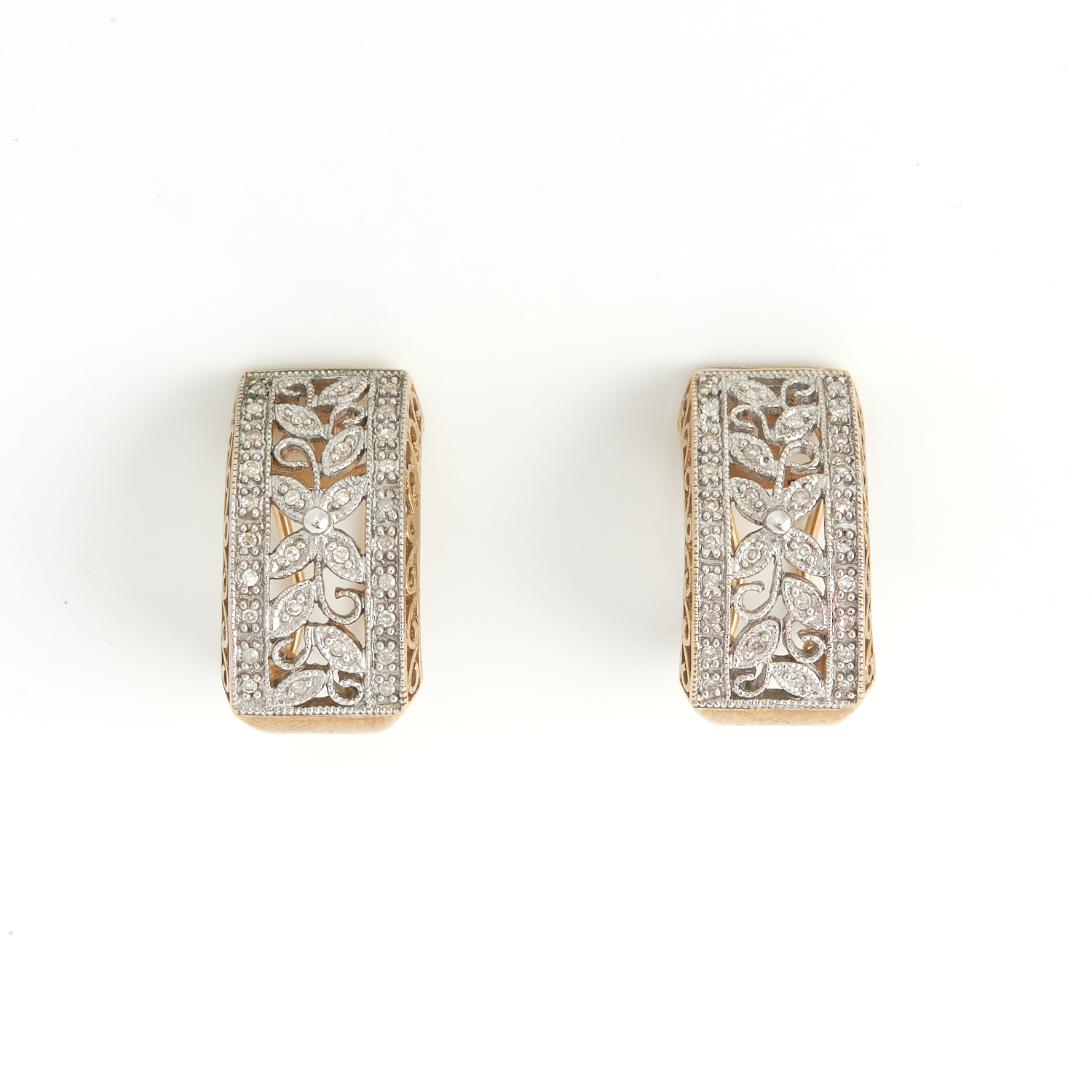 A PAIR OF DIAMOND EARRINGS IN 9CT TWO-TONE GOLD, TO CLIP FITTINGS, LENGTH 22MM, 6.90GMS
