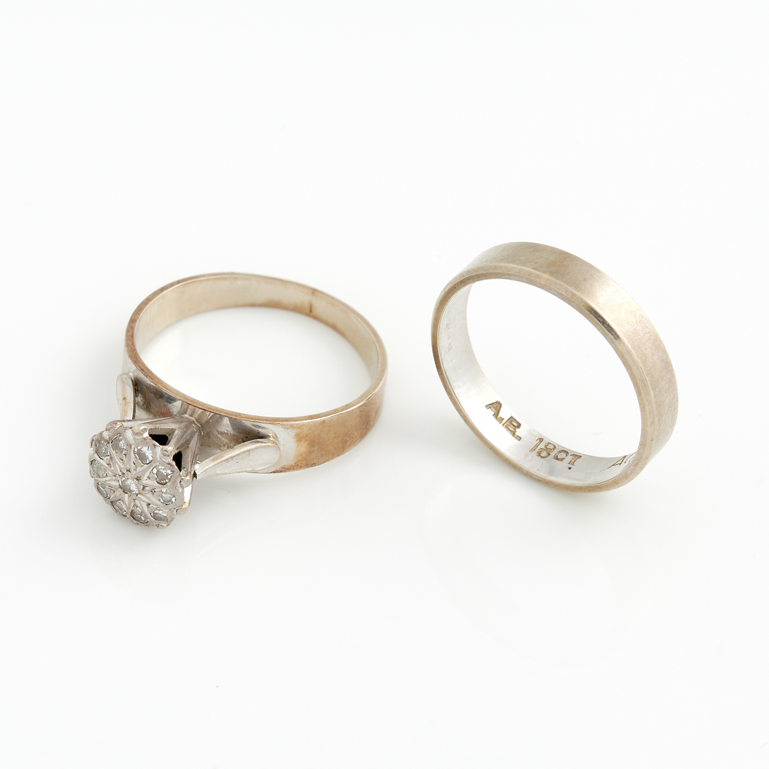 A DIAMOND CLUSTER RING IN 18CT GOLD, SIZE K 1/2, TOGETHER WITH A BAND IN 18CT GOLD, 5.6GMS