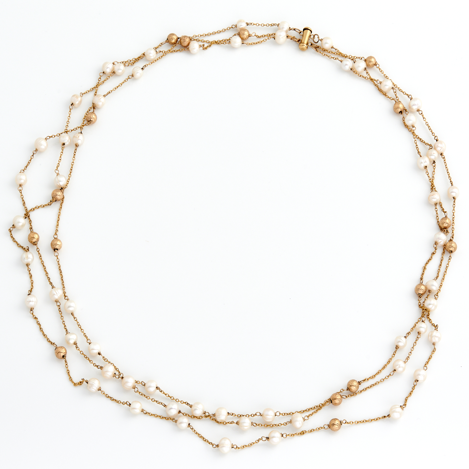 A MULTI STRAND FRESHWATER PEARL NECKLACE IN GOLD PLATE, 790MM