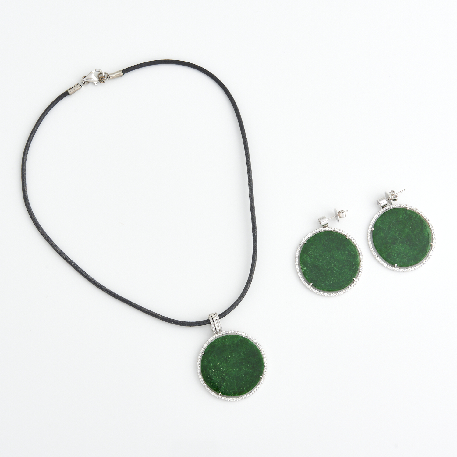 A GREEN HARDSTONE AND DIAMOND SUITE IN 18CT WHITE GOLD, COMPRISING A PENDANT TO NEOPRENE CORD, 620MM AND A PAIR OF EARRINGS TO POST AND BUTTERFLY FITTINGS, LENGTH 45MM