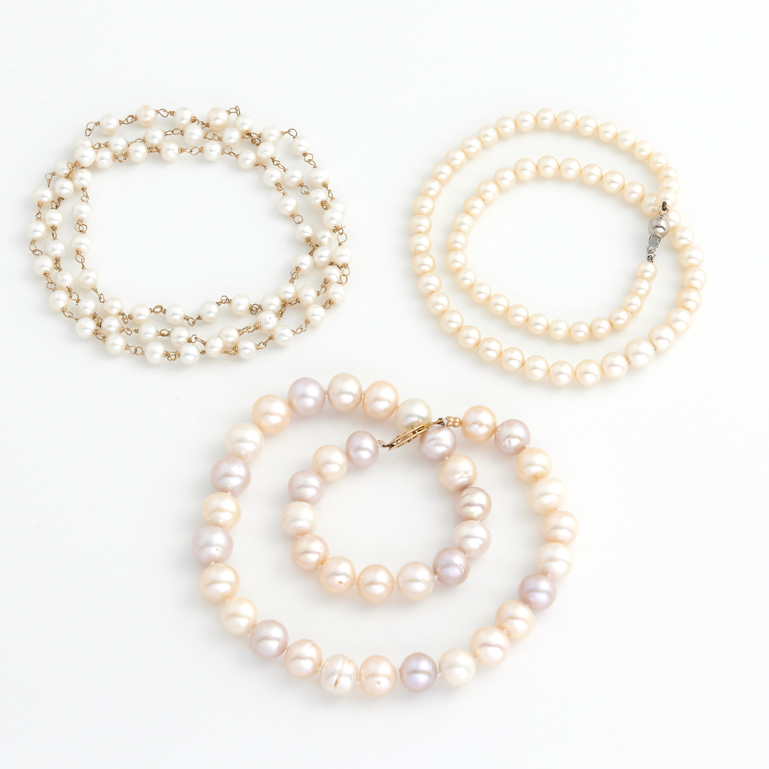THREE STRANDS OF PEARLS TO CLASPS IN BASE METAL AND GOLD PLATE