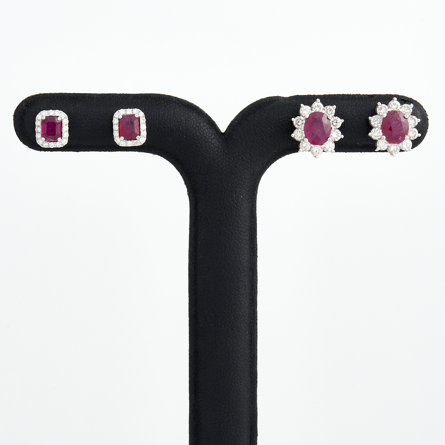 TWO PAIRS OF RUBY AND DIAMOND EARRINGS IN 18CT WHITE GOLD, TO POST AND BUTTERFLY FITTINGS
