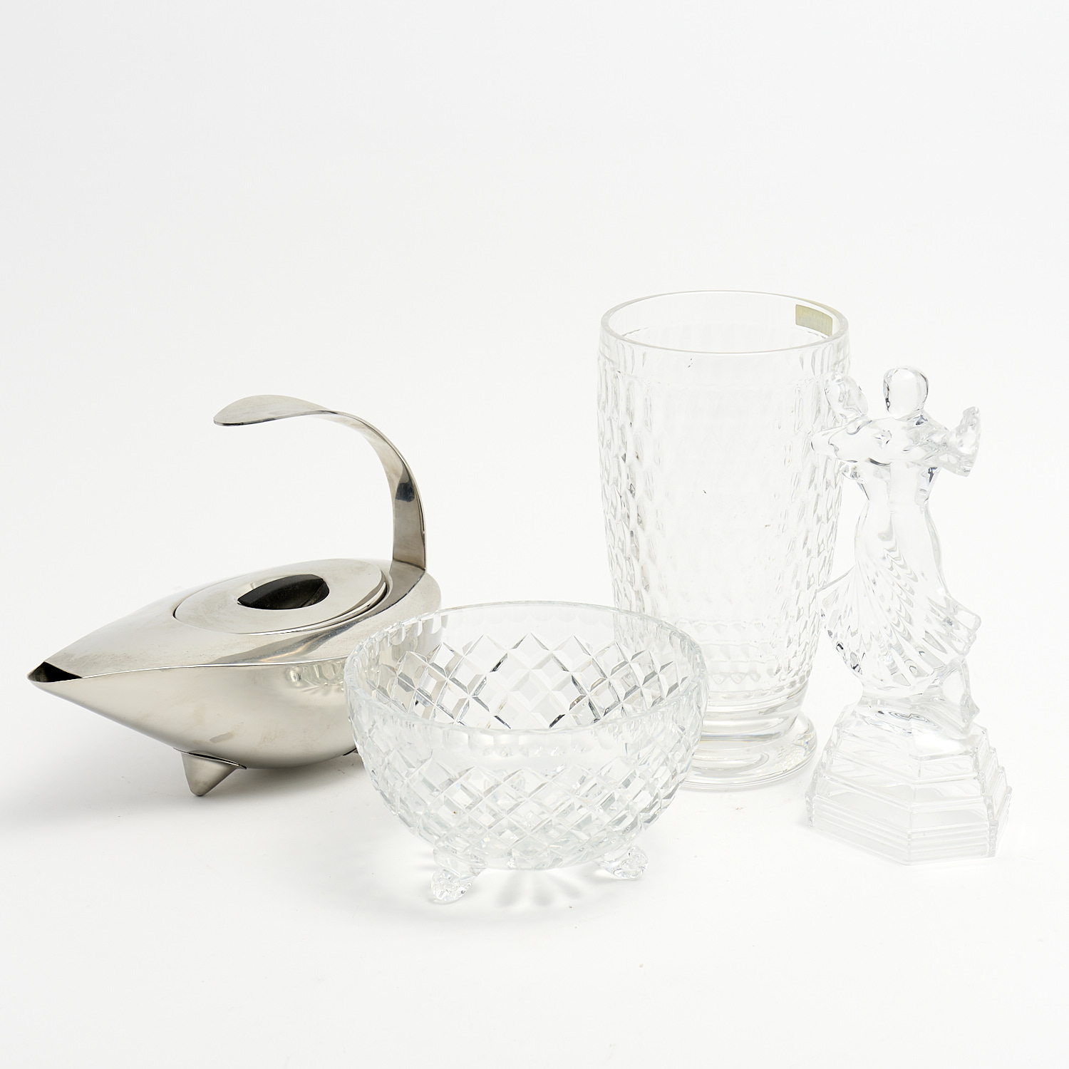 TWO PIECES OF MODERN CRYSTAL INCLUDING A VILLEROY & BOCH VASE, A BOWL, A ROYAL CRYSTAL ROCK DANCING COUPLE, TOGETHER WITH A STAINLESS STEEL BODUM TEA POT H.24CM (TALLEST), LEONARD JOEL DELIVERY SIZE: LARGE