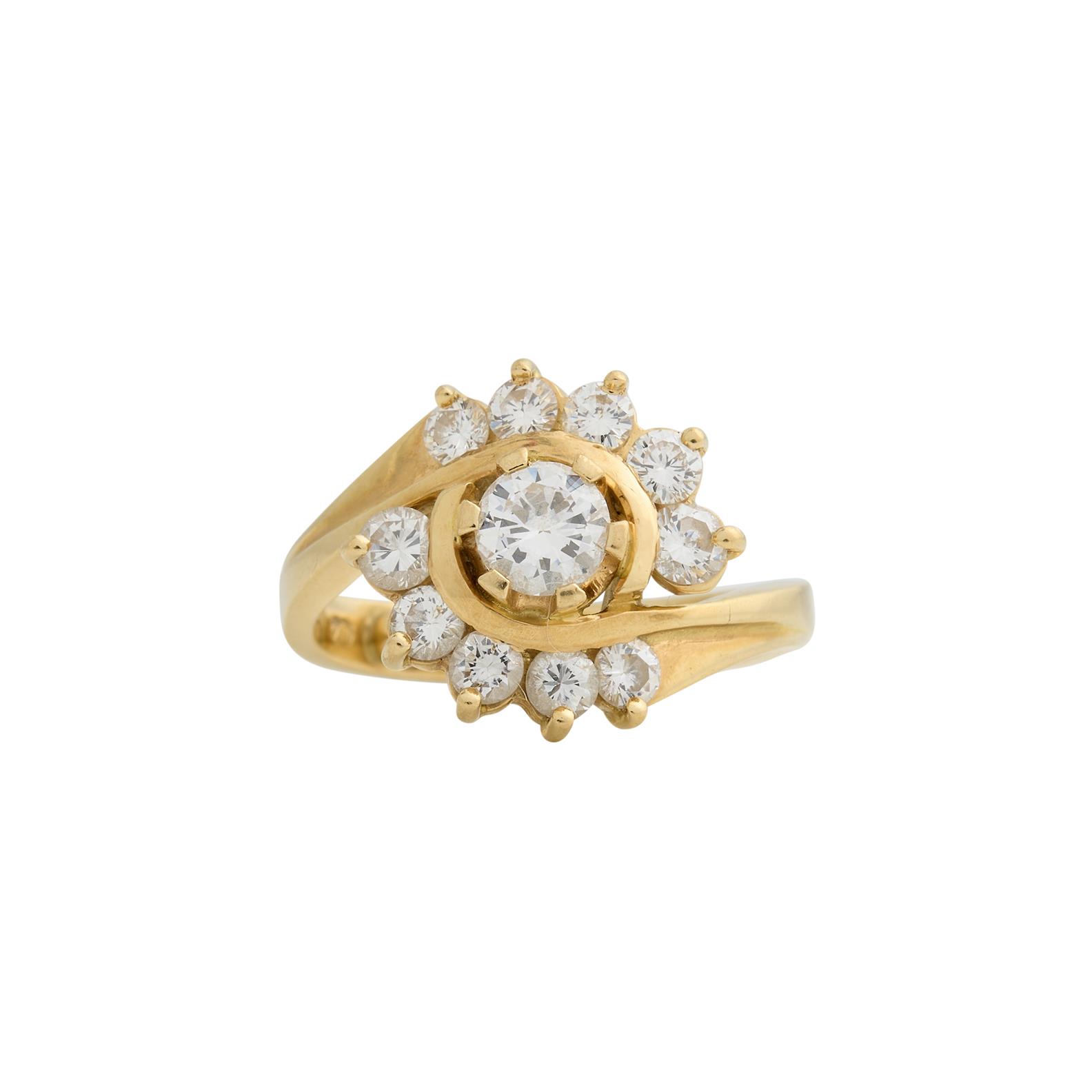 Of cluster design, centring a claw-set brilliant-cut diamond weighing approximately 0.44 carats, within a surround of similarly set diamonds, the small diamonds together weighing approximately 0.45 carats, mounted in 18ct gold, size J1/2, gross weight approximately 6.7 grams.