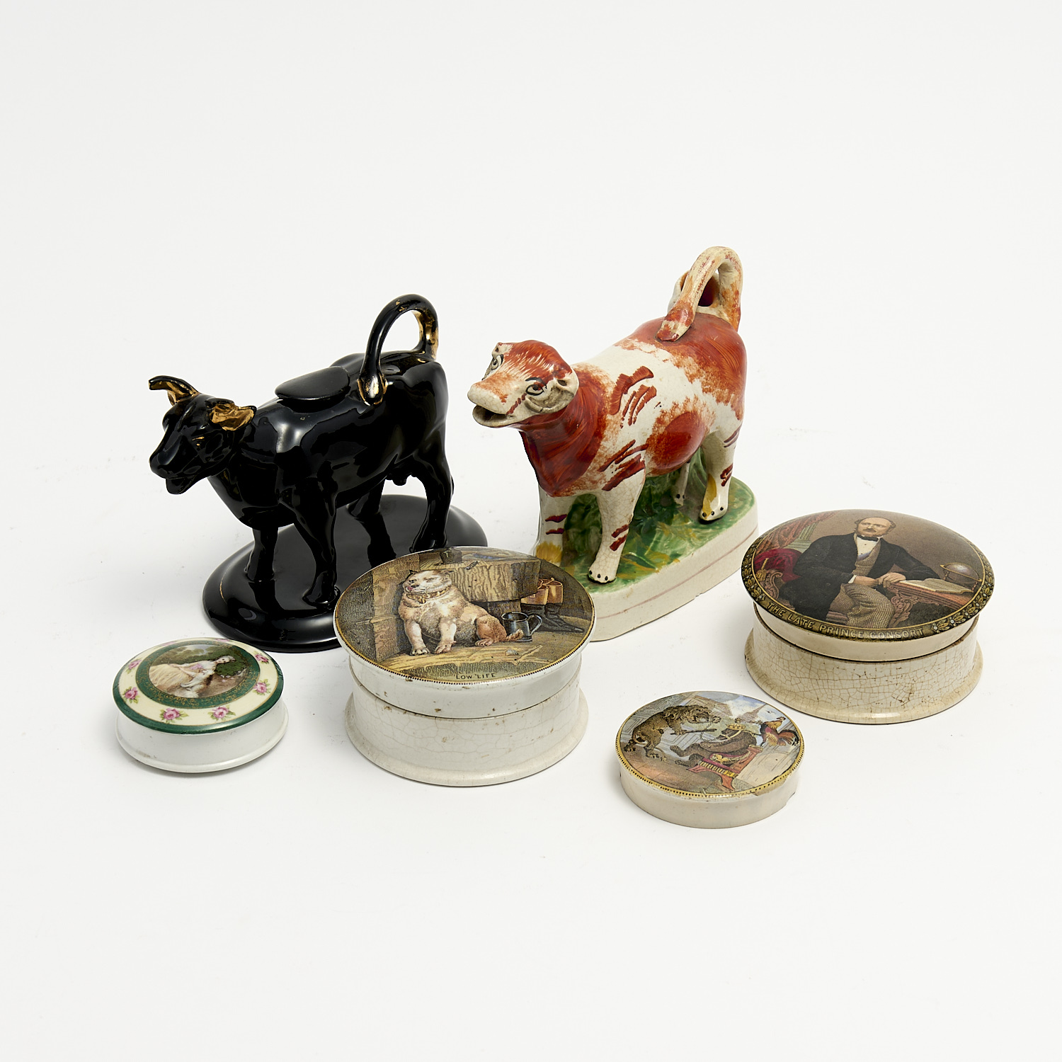 A COLLECTION OF PORCELAIN INCLUDING TWO COW CREAMERS AND THREE PIECES OF PRATWARE L.17CM (LONGEST) (A/F), LEONARD JOEL DELIVERY SIZE: MEDIUM