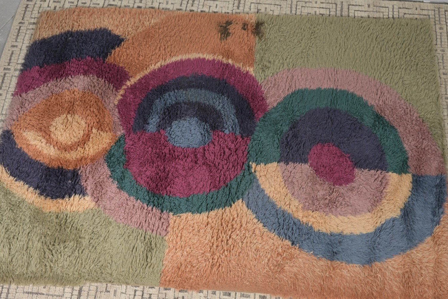 A LARGE DANISH WOOLEN FLOOR RUG IN MULTI COLOURED TONES (244 X 170 CM) (LEONARD JOEL DELIVERY: X-LARGE)
