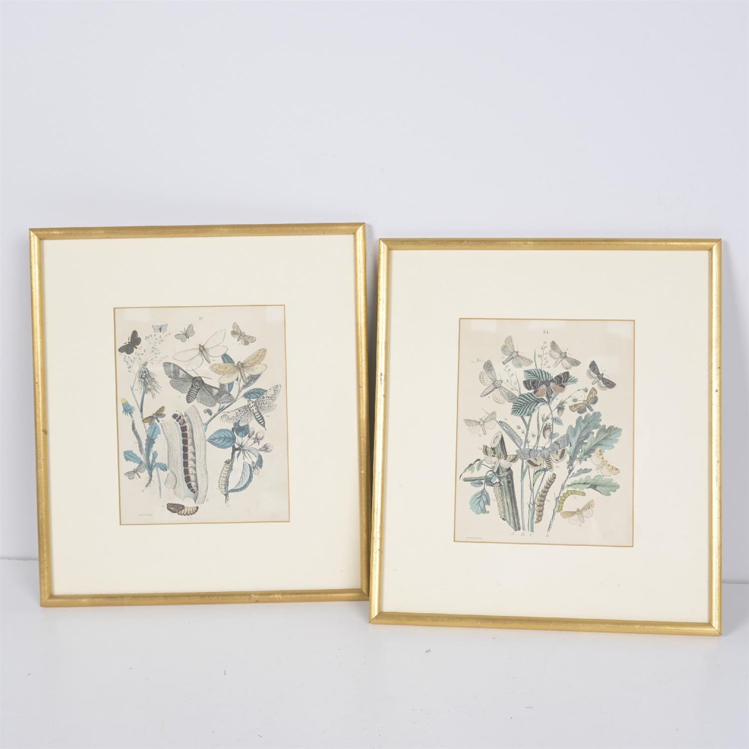 TWO FRAMED HAND COLOURED WOOD ENGRAVINGS FROM BERGE'S BOOK OF BUTTERFLIES TOGETHER WITH A DECOUPAGE BUTTERFLY PRINT AND A FLORAL SILK NEEDLEWORK (FRAME A/F). (40H X 35W CM) (LEONARD JOEL DELIVERY: MEDIUM). Provenance: Private Collection, Toorak