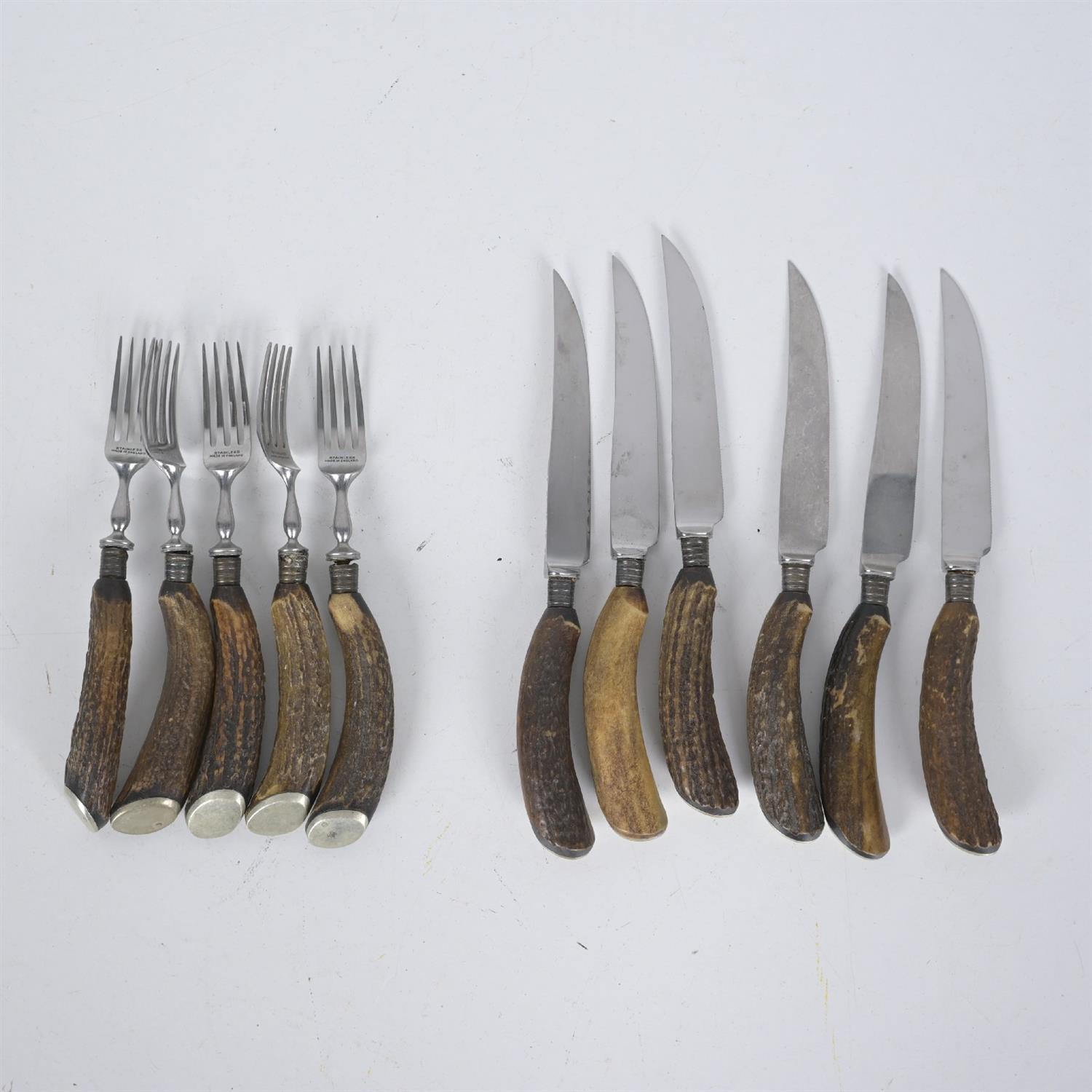 A SET OF ENGLISH ANTLER HANDLED AND STAINLESS STEEL FORKS AND KNIVES FOR FIVE WITH ONE ADDITIONAL KNIFE. (22H CM) (LEONARD JOEL DELIVERY: SMALL). Provenance: Private Collection, Toorak