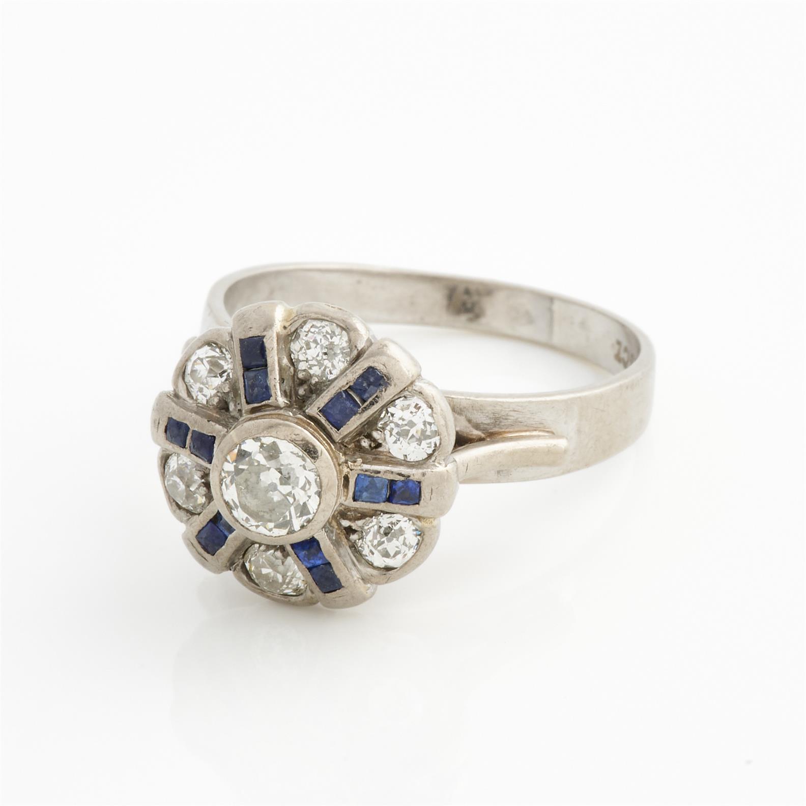 A SAPPHIRE AND DIAMOND RING IN 18CT WHITE GOLD, THE CENTRAL DIAMOND WEIGHING APPROXIMATELY 0.25CTS, SIZE P 1/2, 6.7GMS