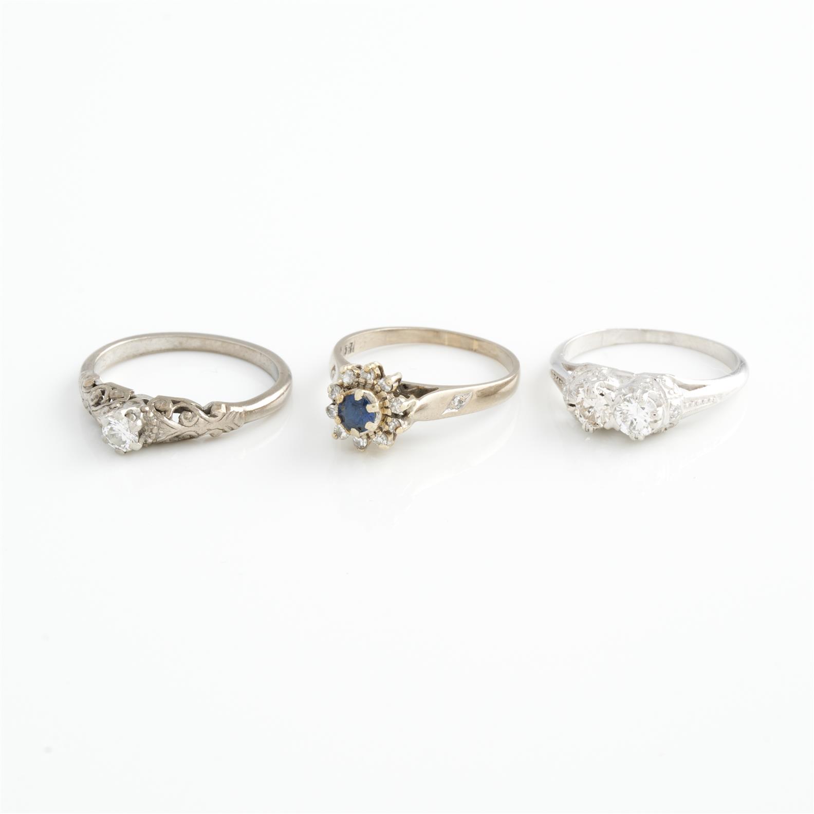 A COLLECTION OF THREE DIAMOND RINGS IN 9CT WHITE GOLD, ONE SAPPHIRE SET, SIZES L-M, 7.4GMS