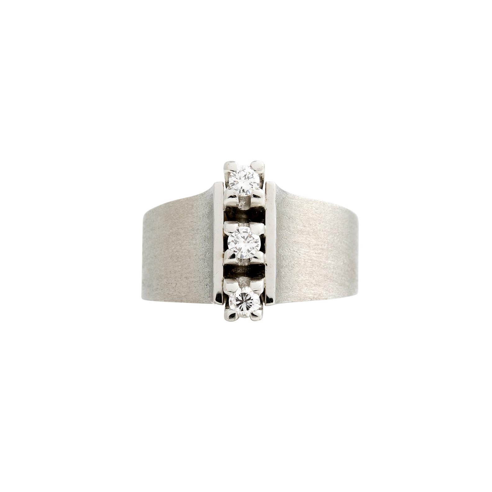 Centring a line of three claw-set brilliant-cut diamonds to shoulders with a textured finish, the diamonds together weighing approximately 0.21 carats, mounted in 14ct white gold, size N1/2, gross weight approximately 8.6 grams.