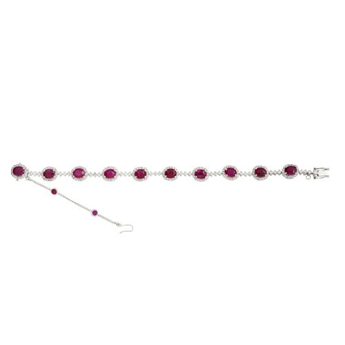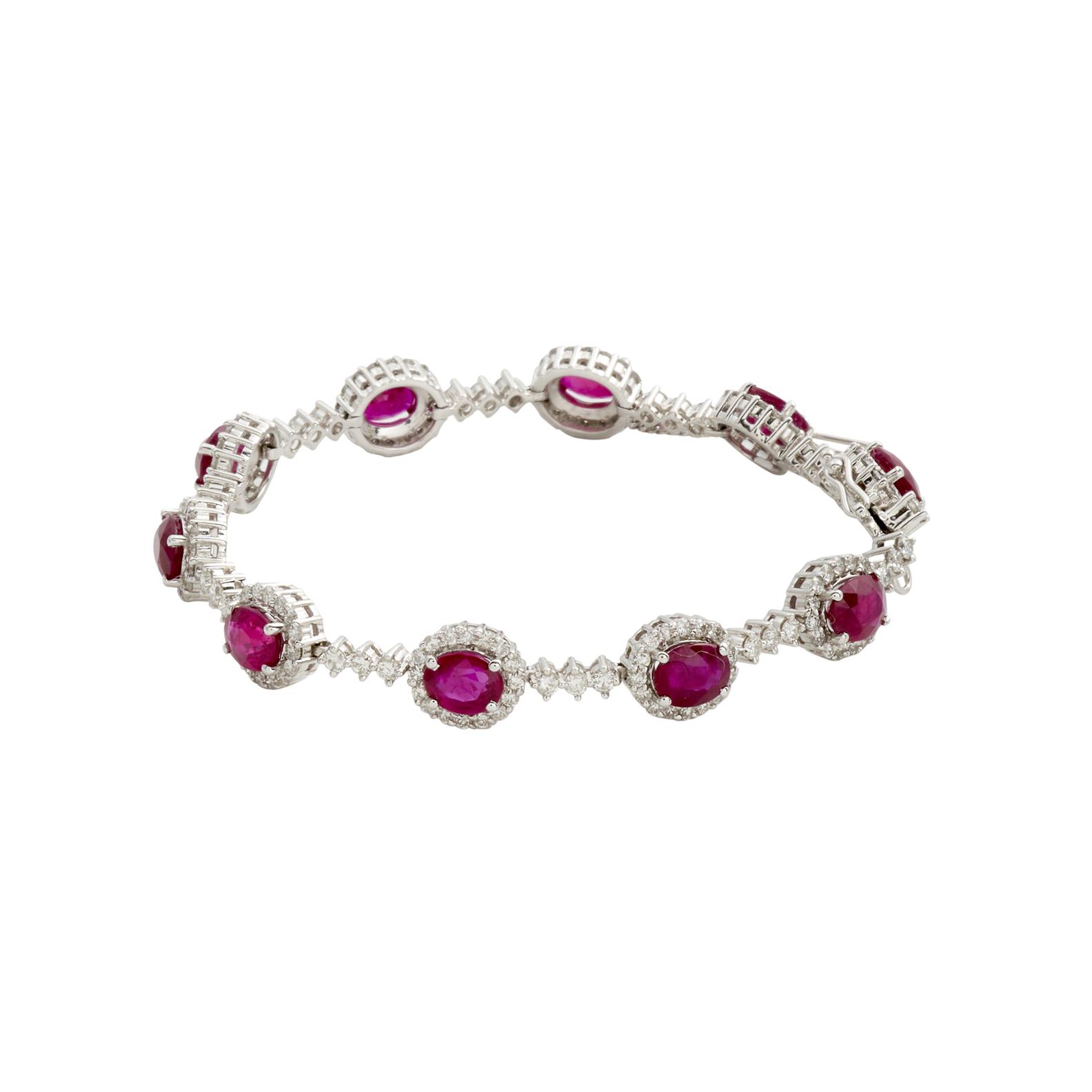 Comprising a line of ten oval-cut ruby and brilliant-cut diamonds clusters, spaced by further brilliant-cut diamonds, with safety chain detailed with two circular-cut rubies, to a concealed tongue and groove clasp with double figure of eight safety catches, the rubies together weighing approximately 10.43 carats, the diamonds together weighing approximately 3.08 carats, length 170mm, gross weight approximately 18.3 grams.