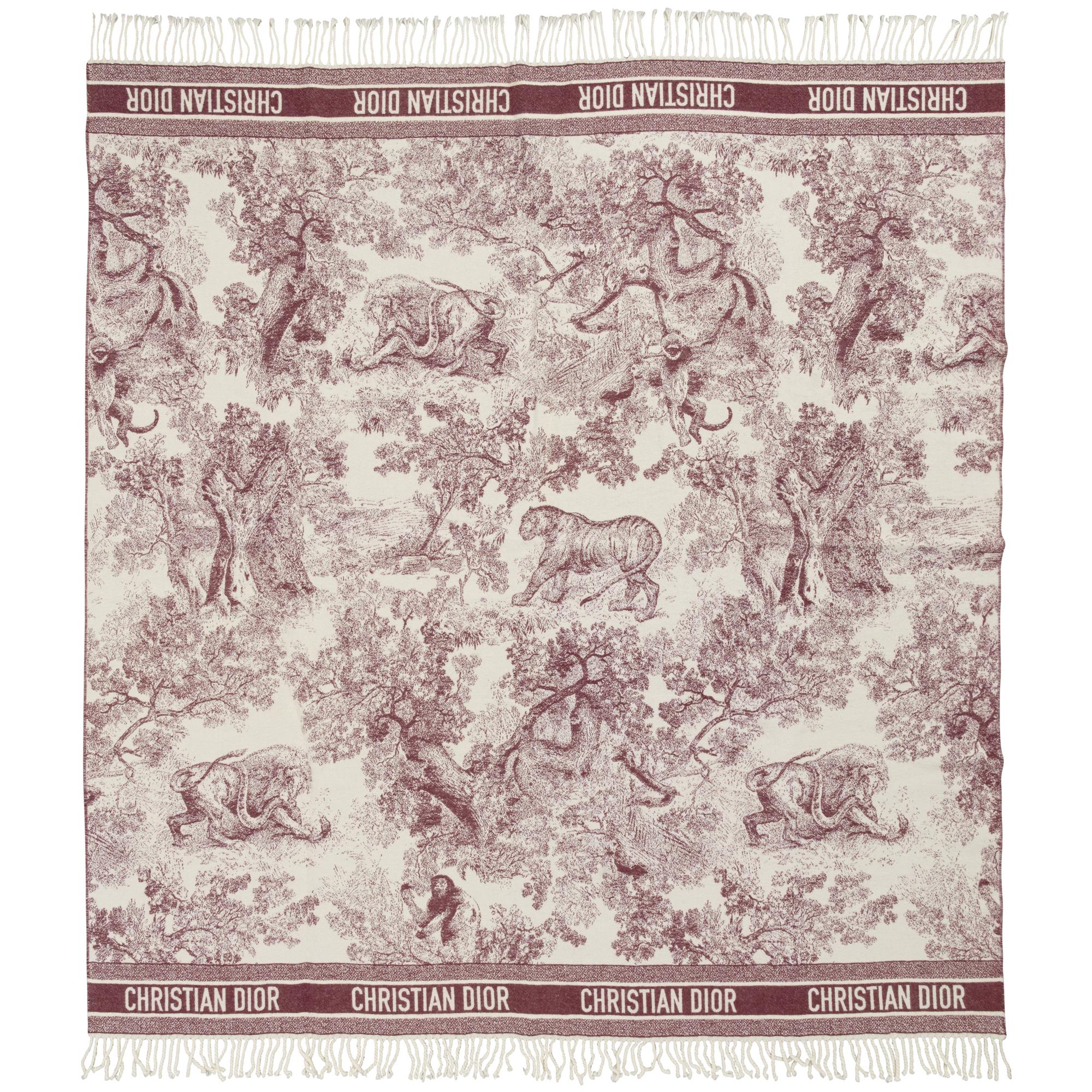 Styled in burgundy and white Toile De Jouy printed wool with tassel edge detail, 130 x 140cm.