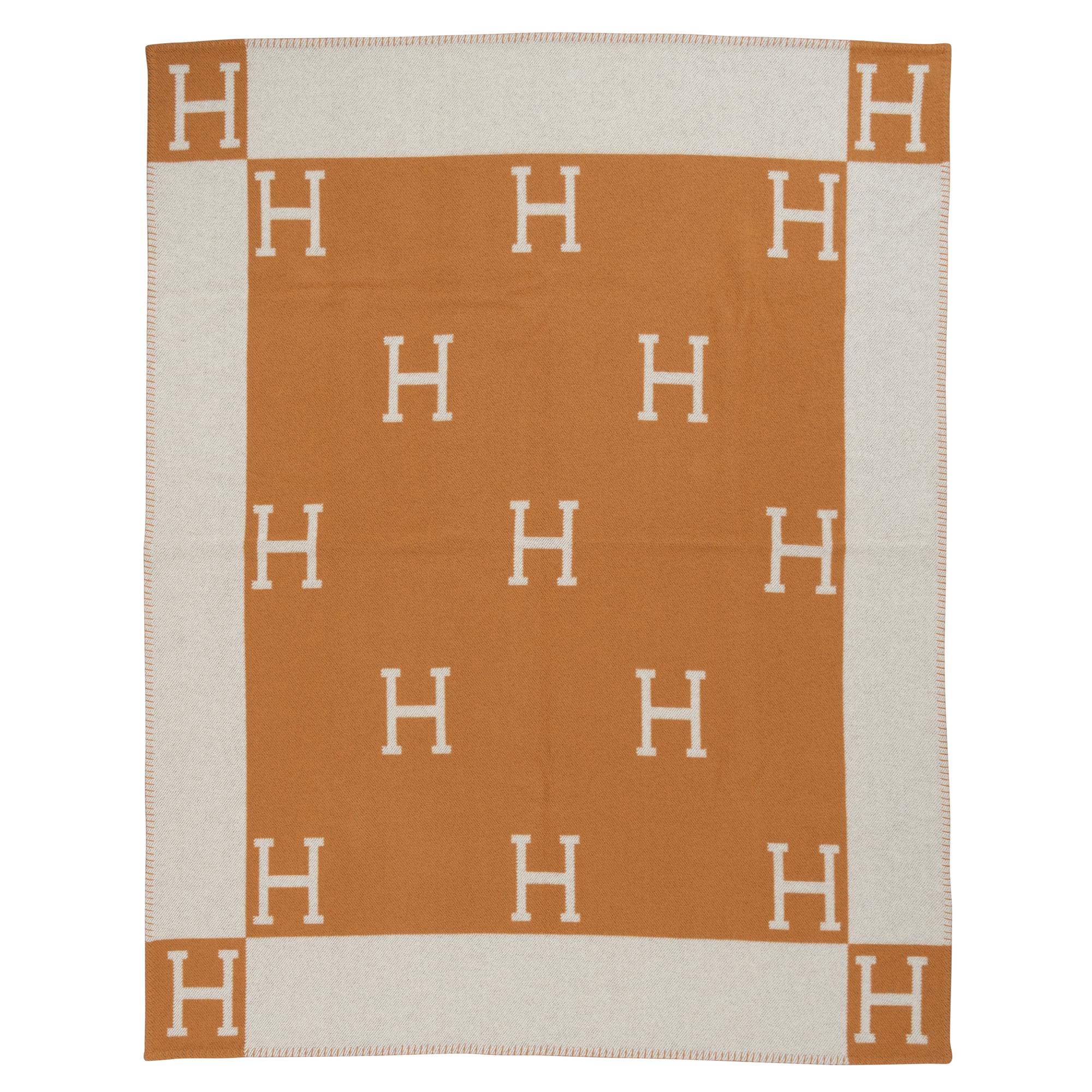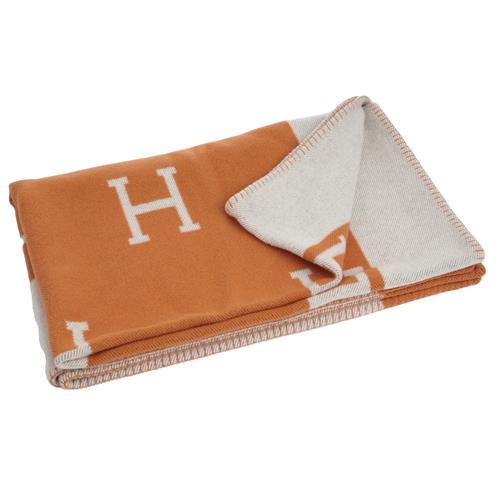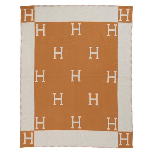 Styled in Écru and Potiron Merinos wool and cashmere, featuring tonal hand stitched border, 135 x 170cm.