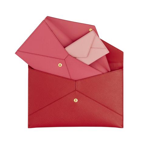 Styled in red Saffiano leather with gold tone hardware, featuring tonal logo accent, comprising a wallet in hot pink Saffiano leather and coin purse in baby pink Saffiano leather, 15 x 23cm, 11 x 20cm and 6.5 x 10.5cm.