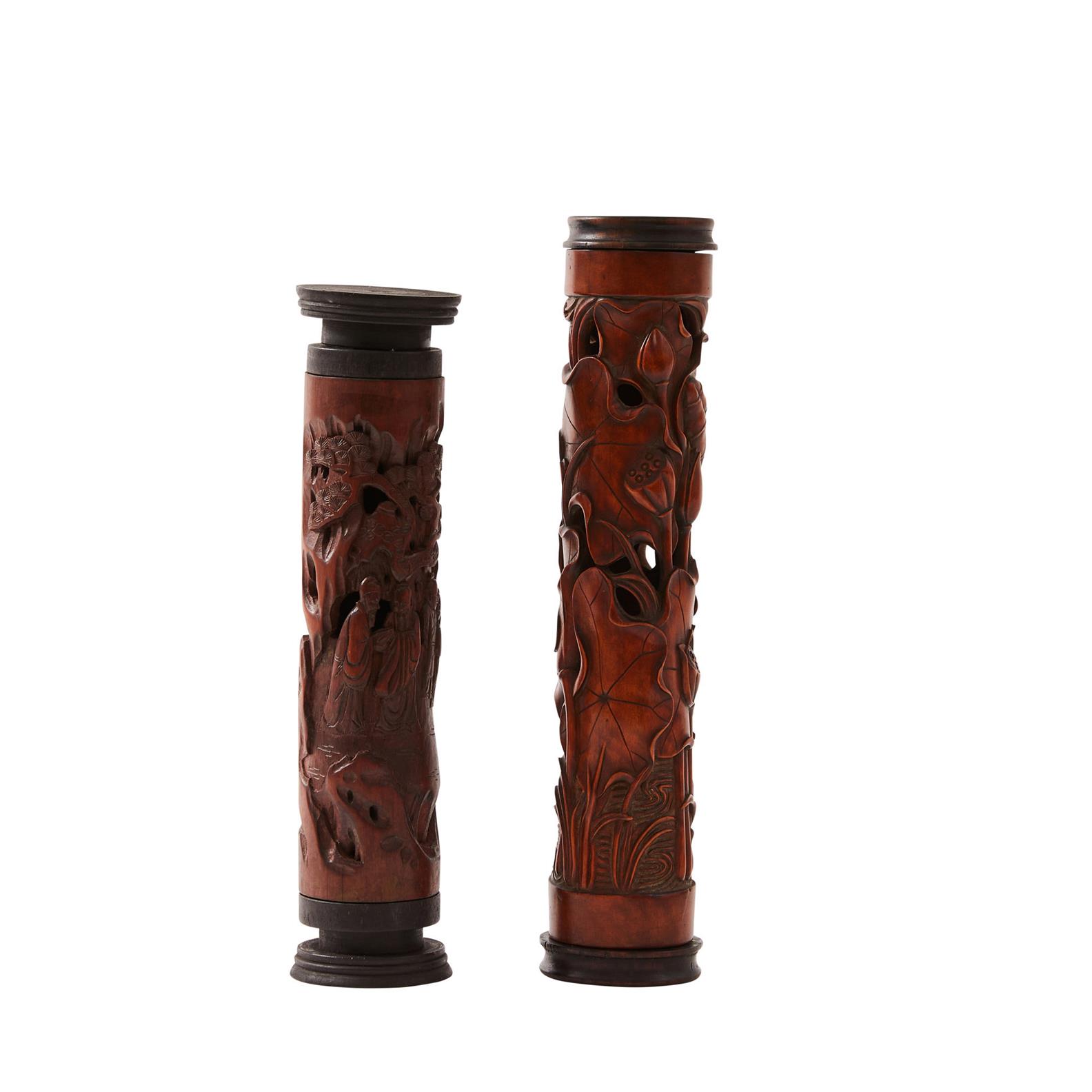One carved and pierced with lotus leaves and pods, the other with a group of sages beneath a pine and rockwork.