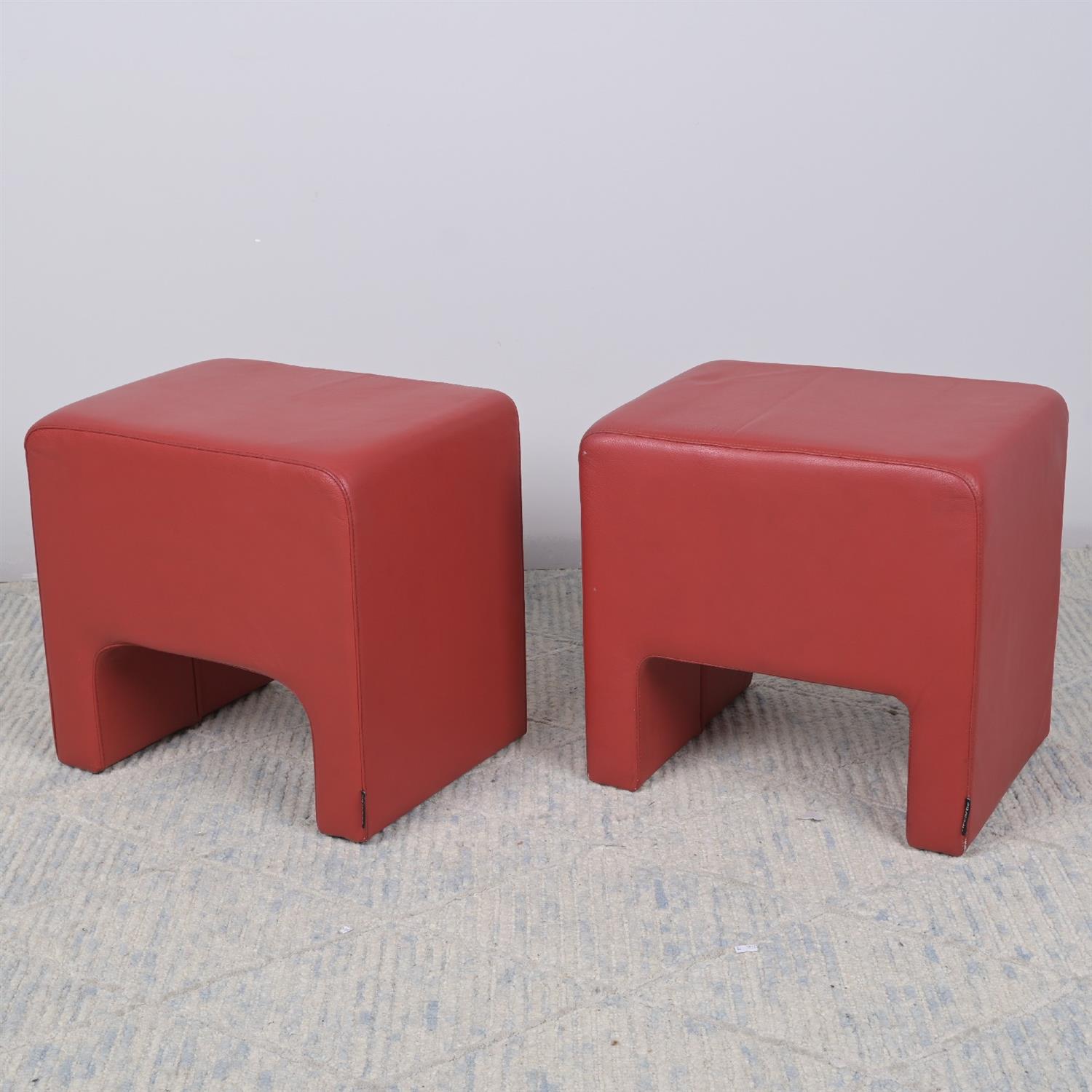 A PAIR OF RED LEATHER STOOLS FOR VICCARBE (44H X 48W X 38D CM) (LEONARD JOEL DELIVERY: LARGE)