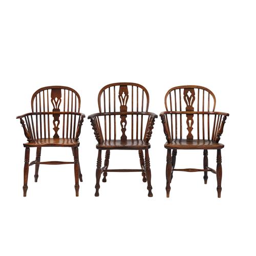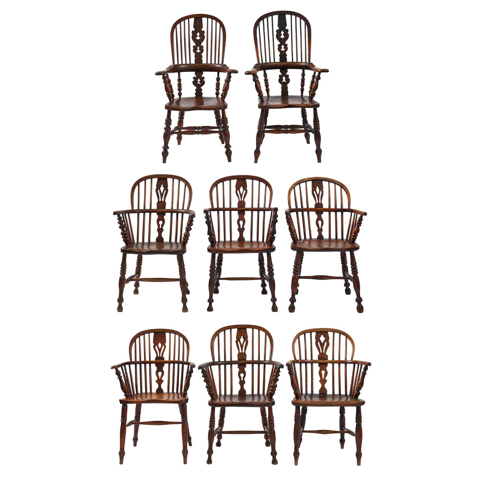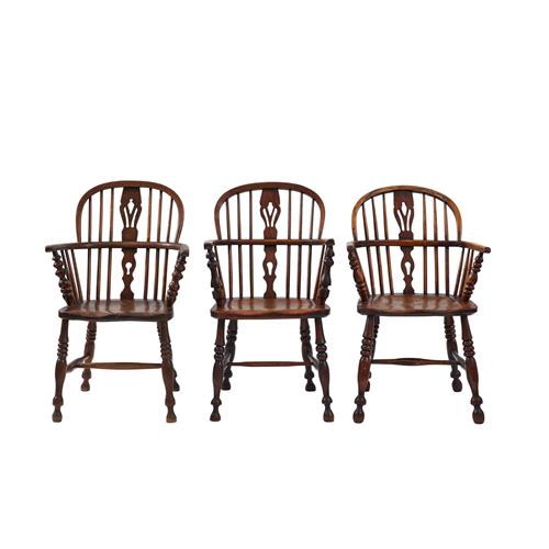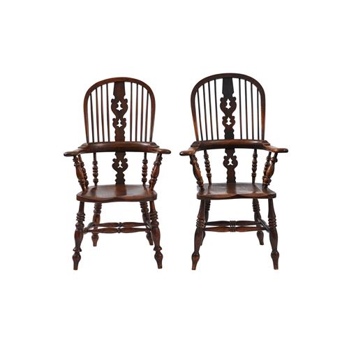 Of typical design with arched stick back and pierced shaped splats above solid seats on turned legs.