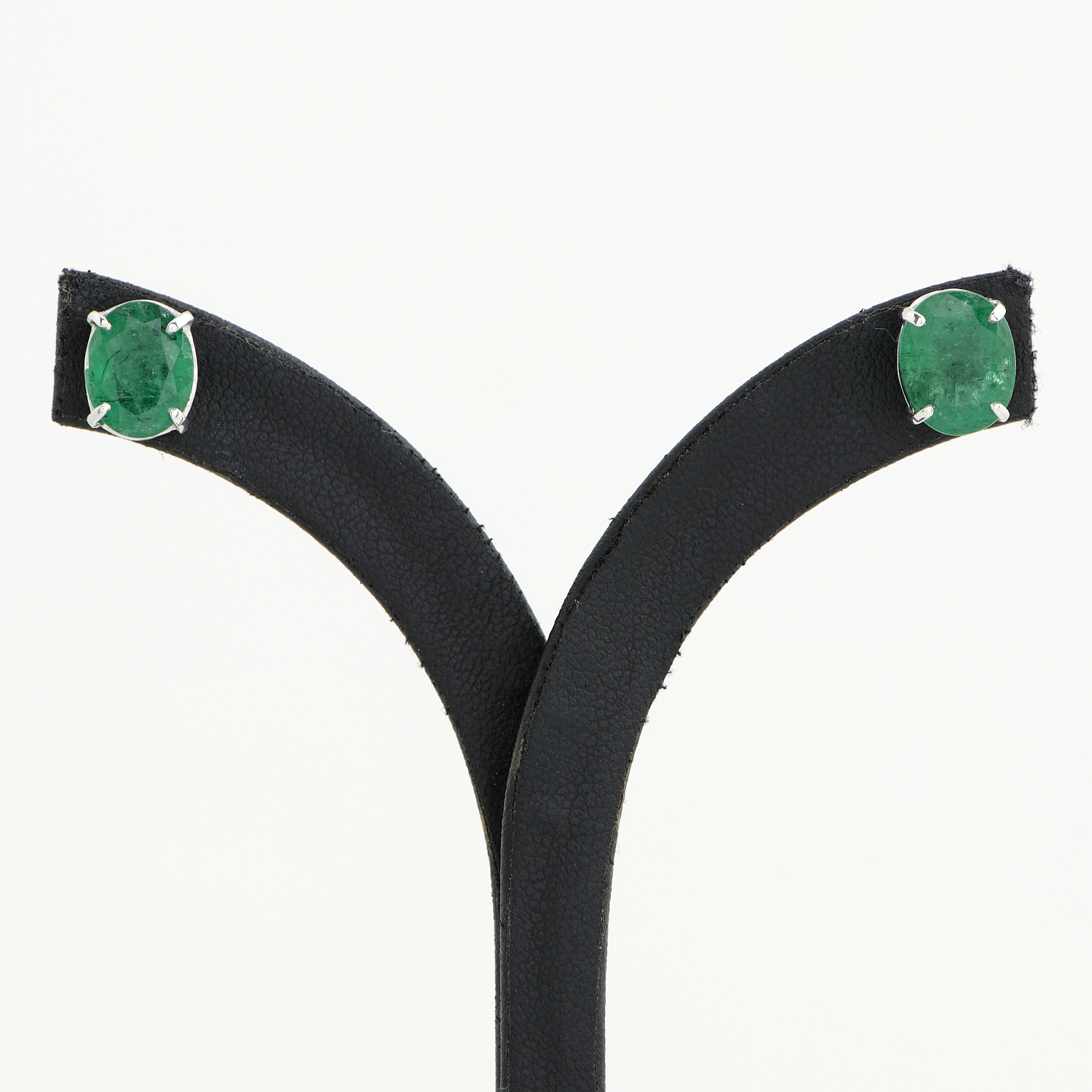 A PAIR OF EMERALD EARRINGS TO POST AND BUTTERFLY FITTINGS IN 18CT WHITE GOLD, THE EMERALDS TOTALLING 5.48CTS, 3.0GMS