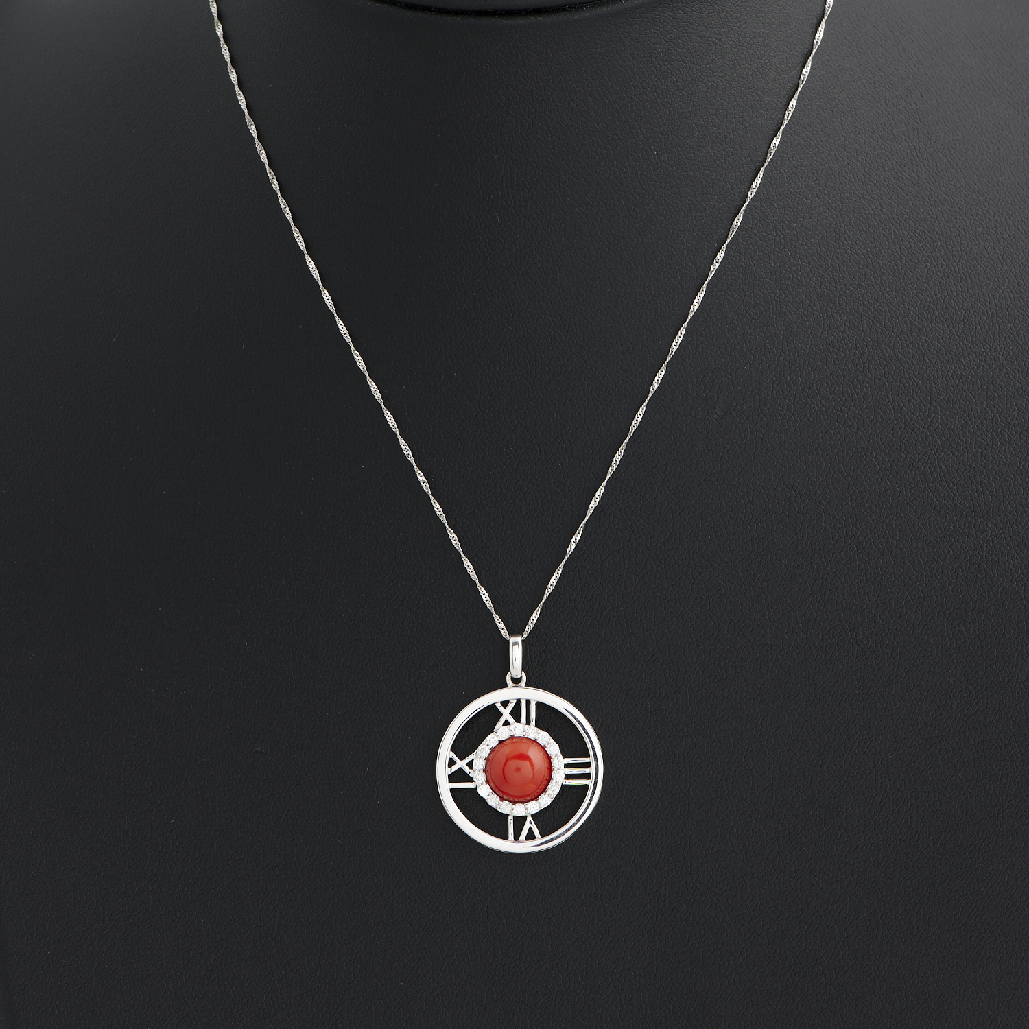 A CORAL AND DIAMOND PENDANT NECKLACE IN 18CT WHITE GOLD, 520MM, 4.3GMS
