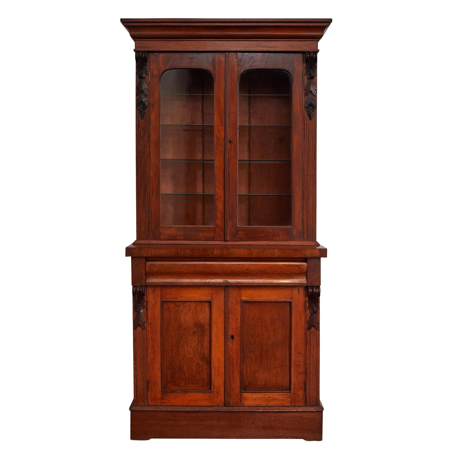 Having a shaped cornice above a plain frieze and a pair of glazed doors enclosing later glass shelves, flanked by pendant flowers and scrolls, the base with a shaped frieze drawer above a pair of panelled cupboards enclosing shelves and flanked by scrolls, on a plinth base.