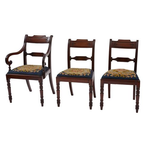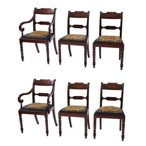 Including two elbow chairs, the scrolled top rail with incised decoration, above a tablet and scroll back rail, flanked by reeded uprights, the drop-in seat upholstered in antique needlework on turned tapering front legs.