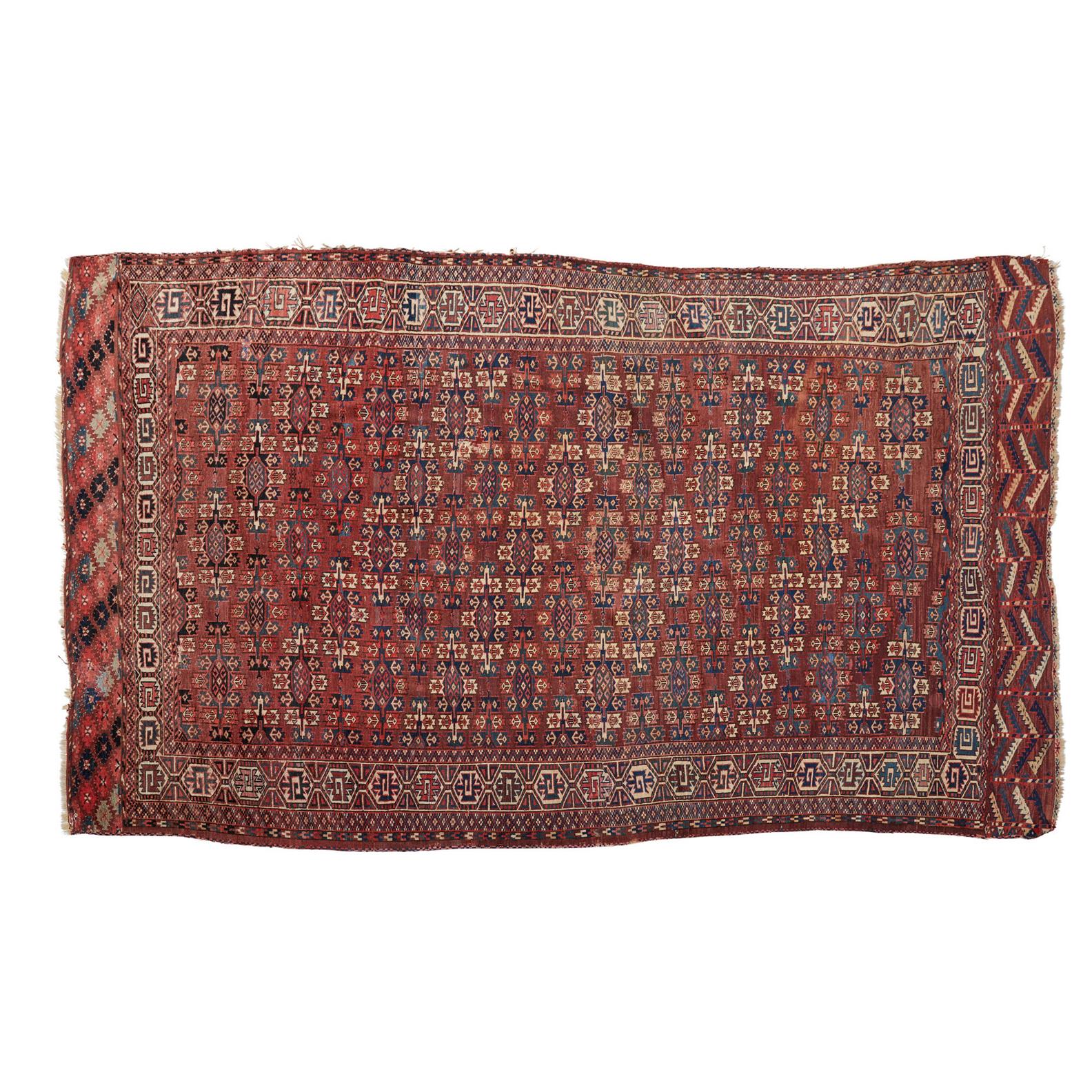 Repair to border, and losses and repairs to one end, areas of wear to centre of carpet with two holes, and two small repairs. Probably dates from the first half of the 20th century.
