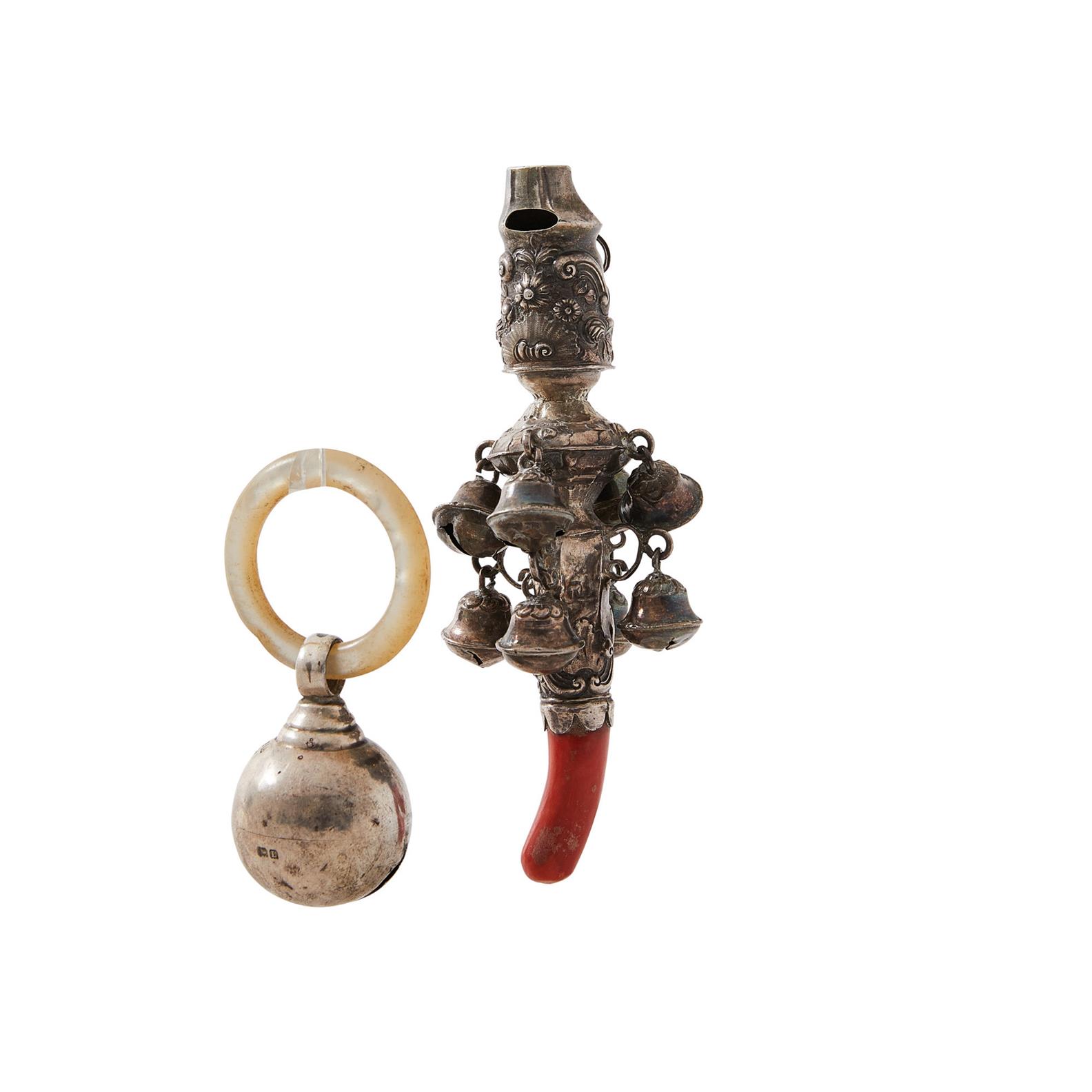 A Georgian example with whistle and coral teether, set with bells, maker's mark SW; the other in the form of a bell with a mother of pearl teether, Birmingham 1936, maker's mark Mappin & Webb.