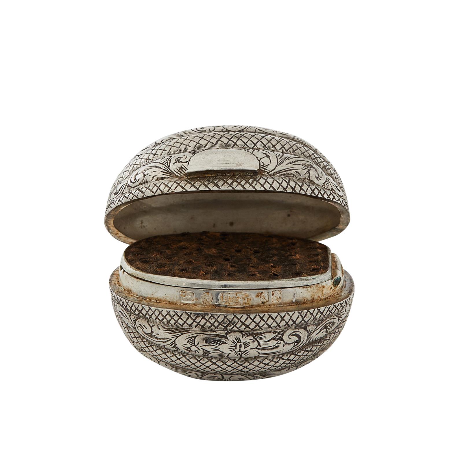 Maker's mark of Hilliard & Thomason, Birmingham 1850, in the form of a stylised nutmeg with all-over engraved decoration.